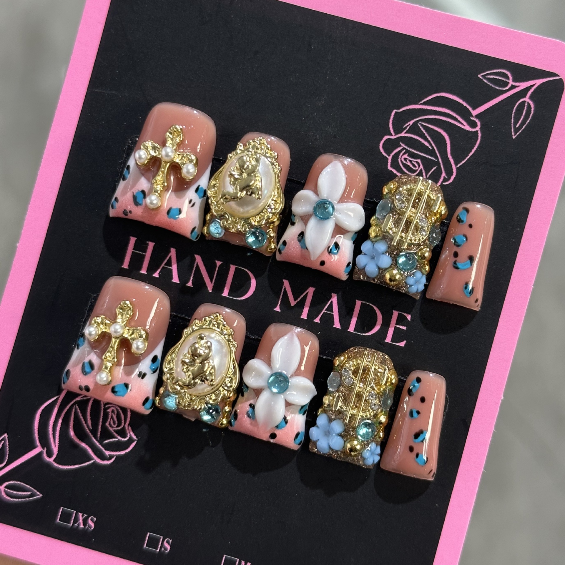 外贸欧美跨境爆品甜酷风鸭嘴甲手绘合金爱心法式豹纹纯手工穿戴甲