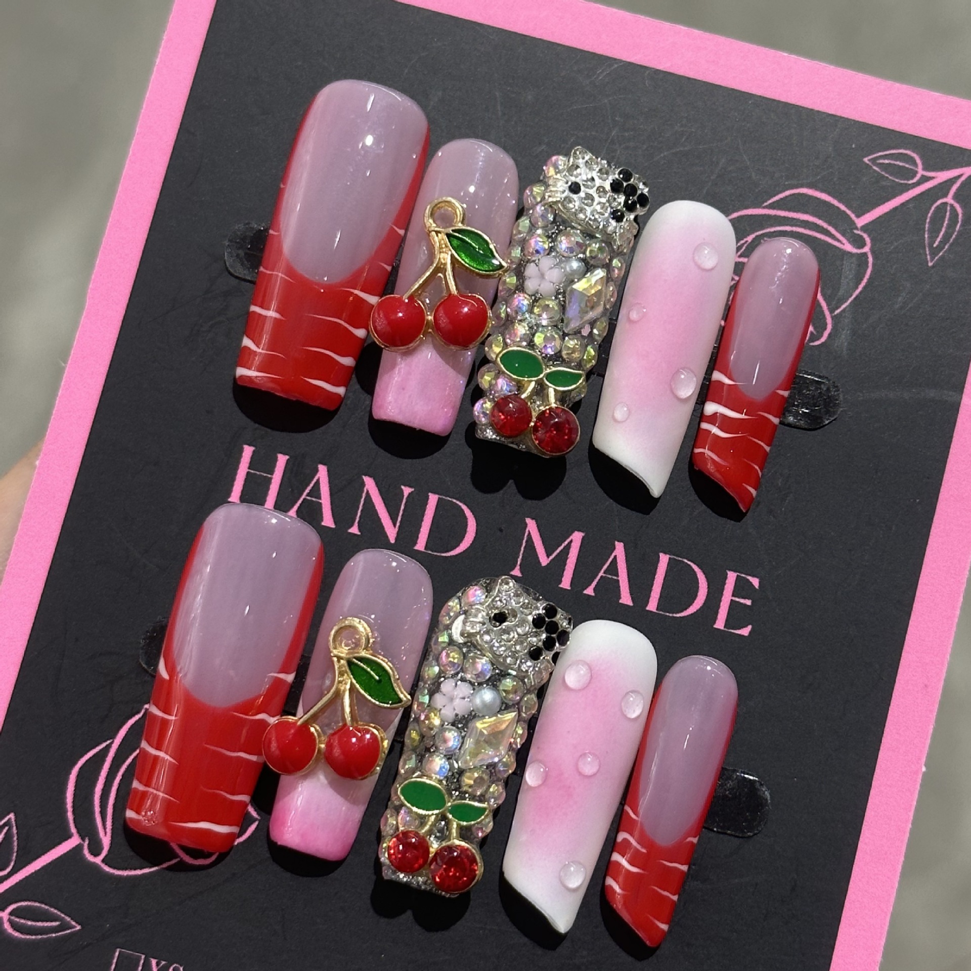 外贸欧美跨境甜酷风鸭嘴甲法式樱桃纯手工穿戴甲Press on nails