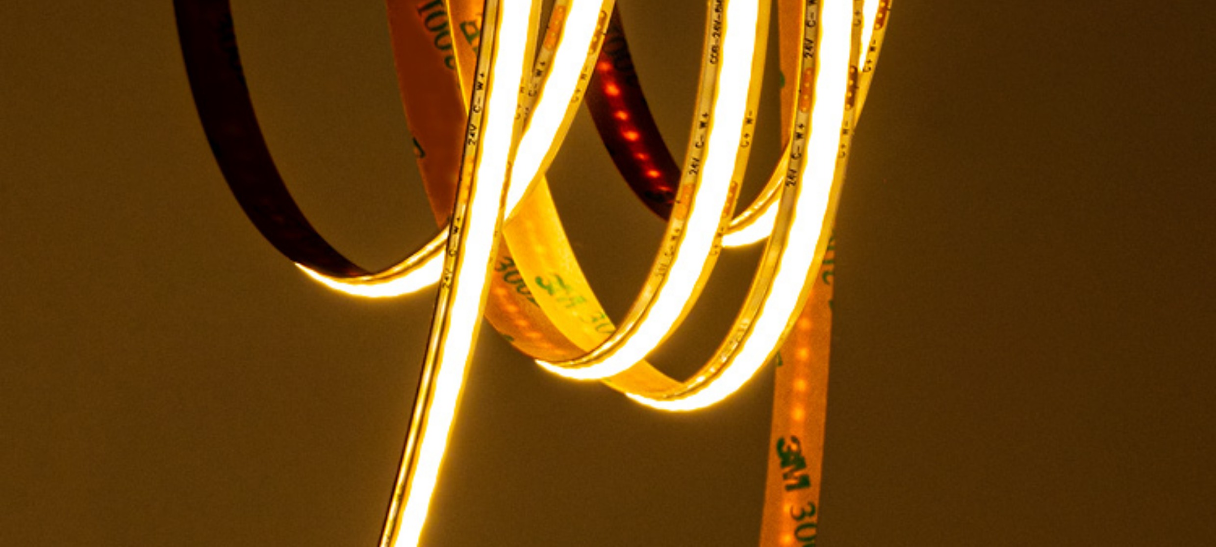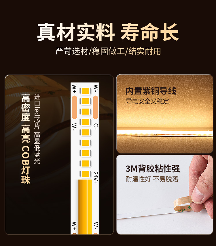 24v低電圧cobランプは、ストロボなしのハイライトledストリップの自己接着リビングルーム家庭用24vフレキシブルなソフトストリップを示しています