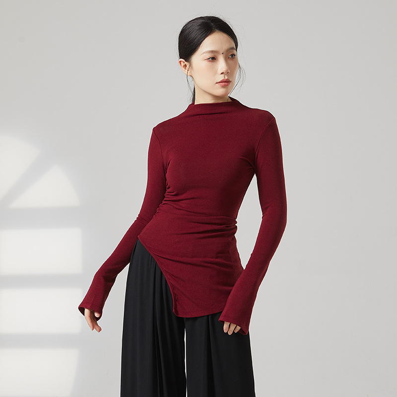 モダンダンストレーニングウェアハーフハイカラーサイドハイスプリットフレアスリーブロングTシャツスポーツフィットネスヨガ長袖