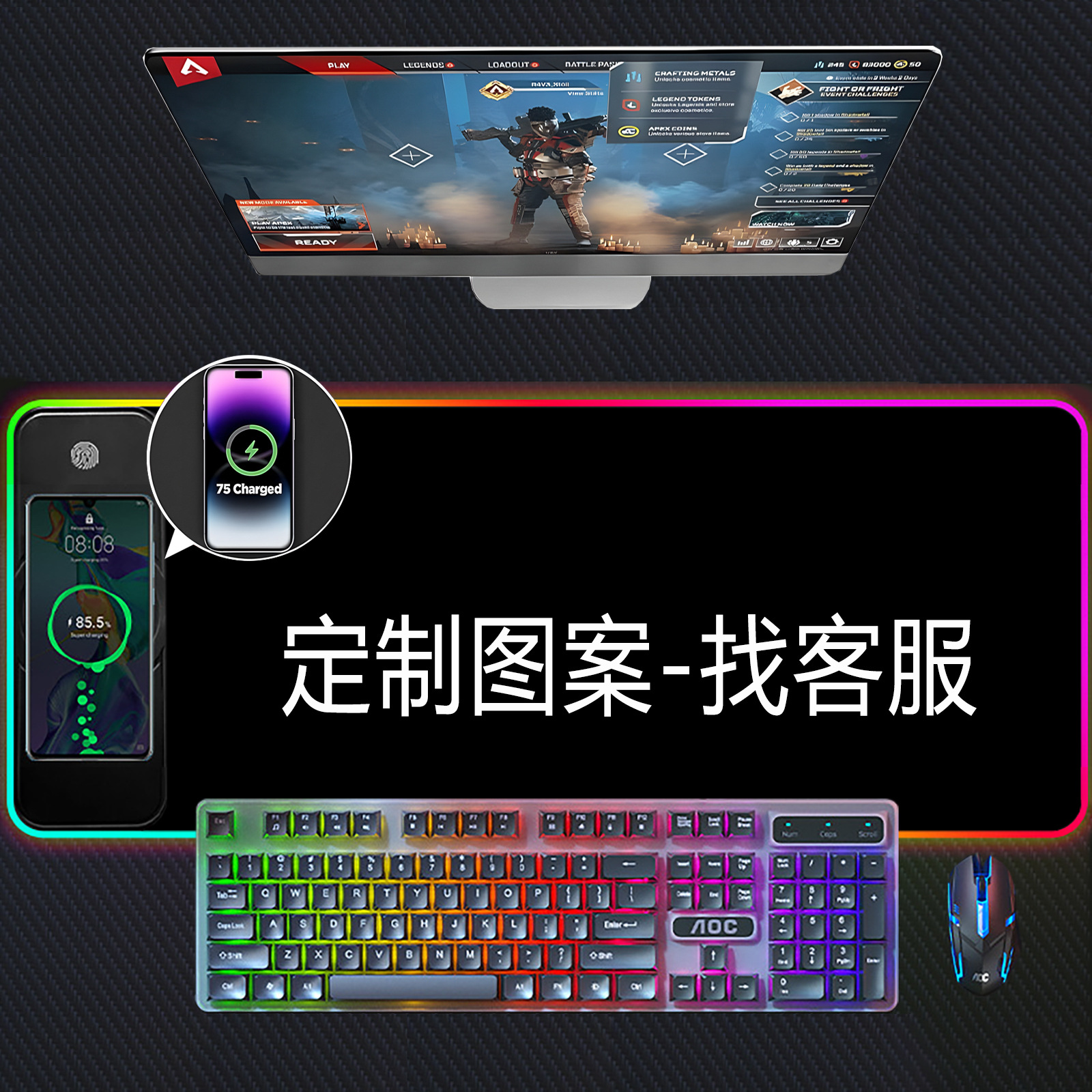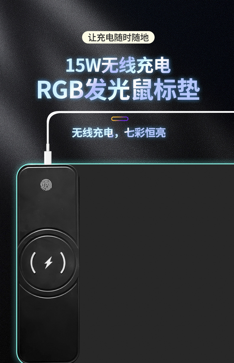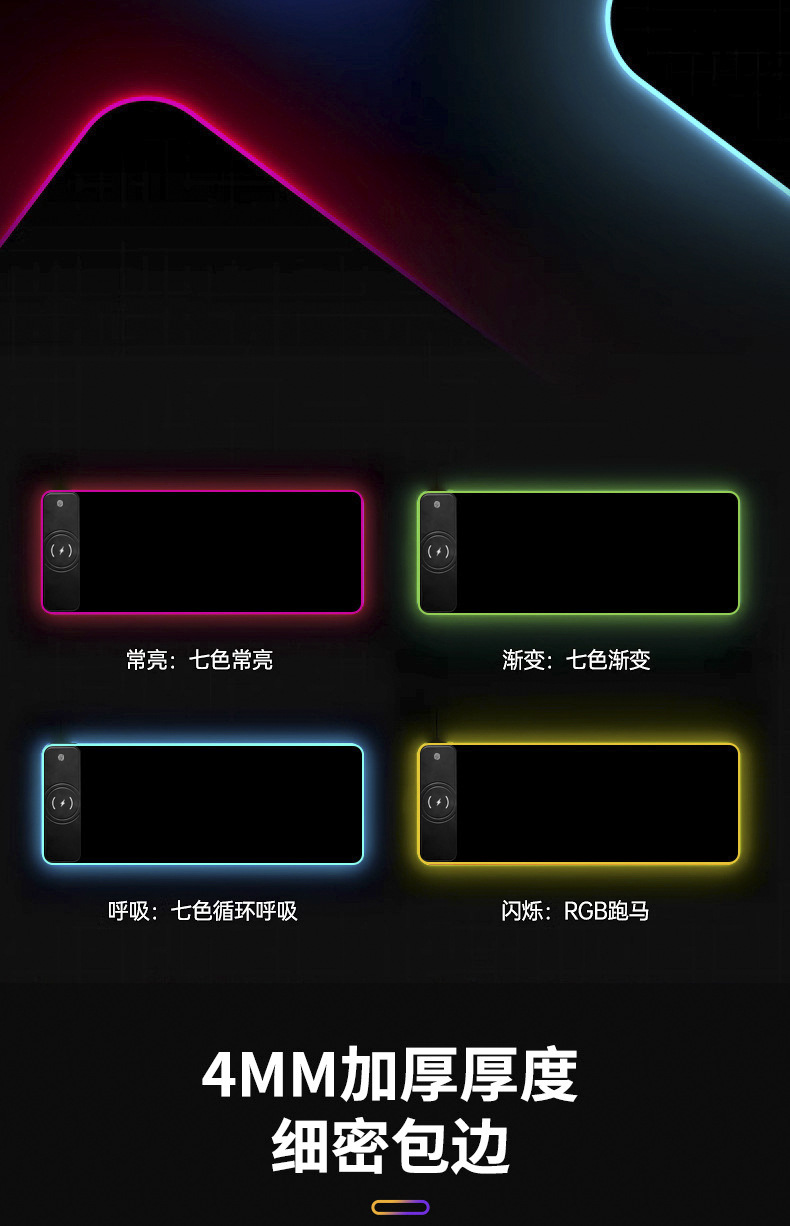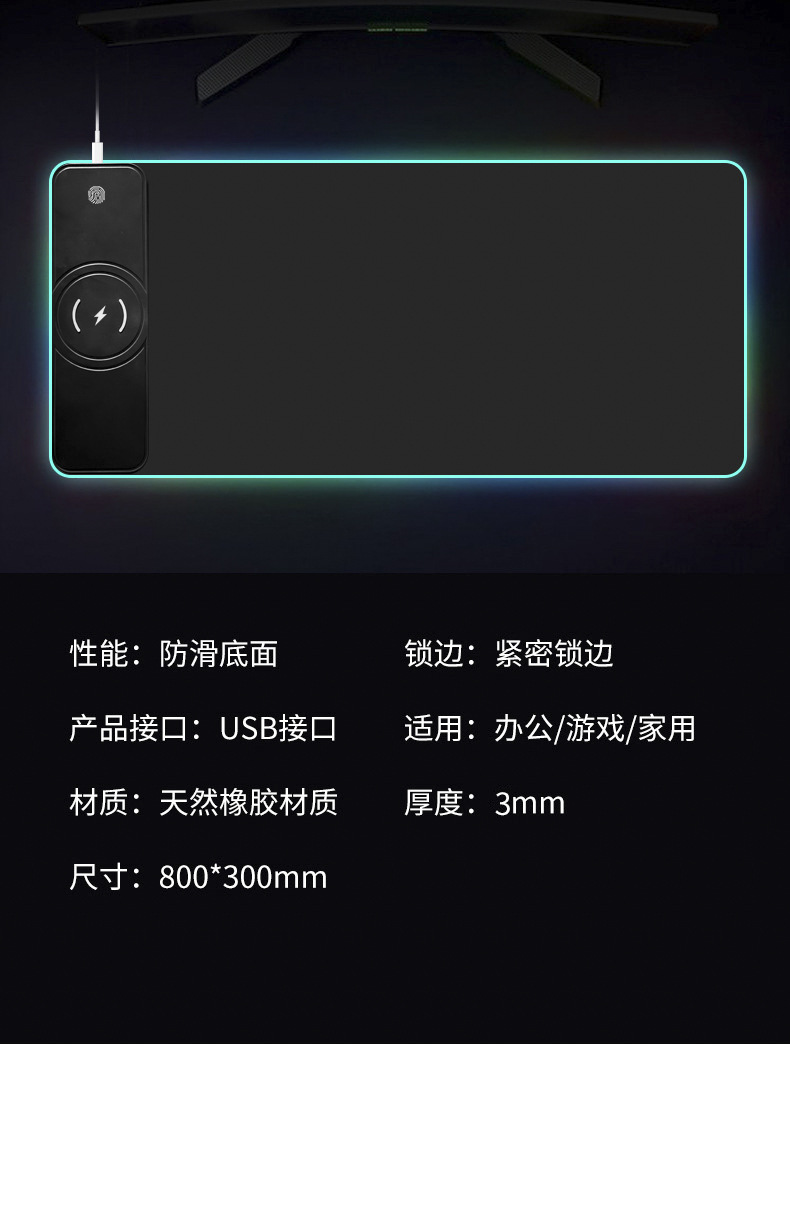 无线充电RGB发光鼠标垫超大15W黑色彩虹发光电脑办公游戏桌垫定制
