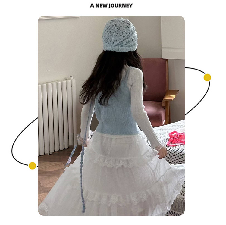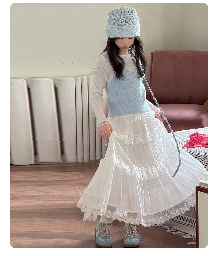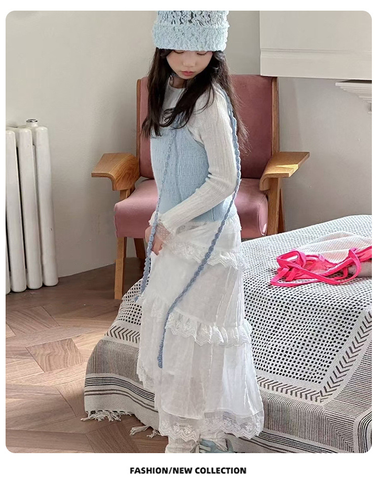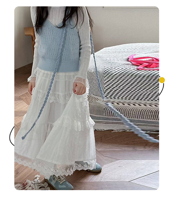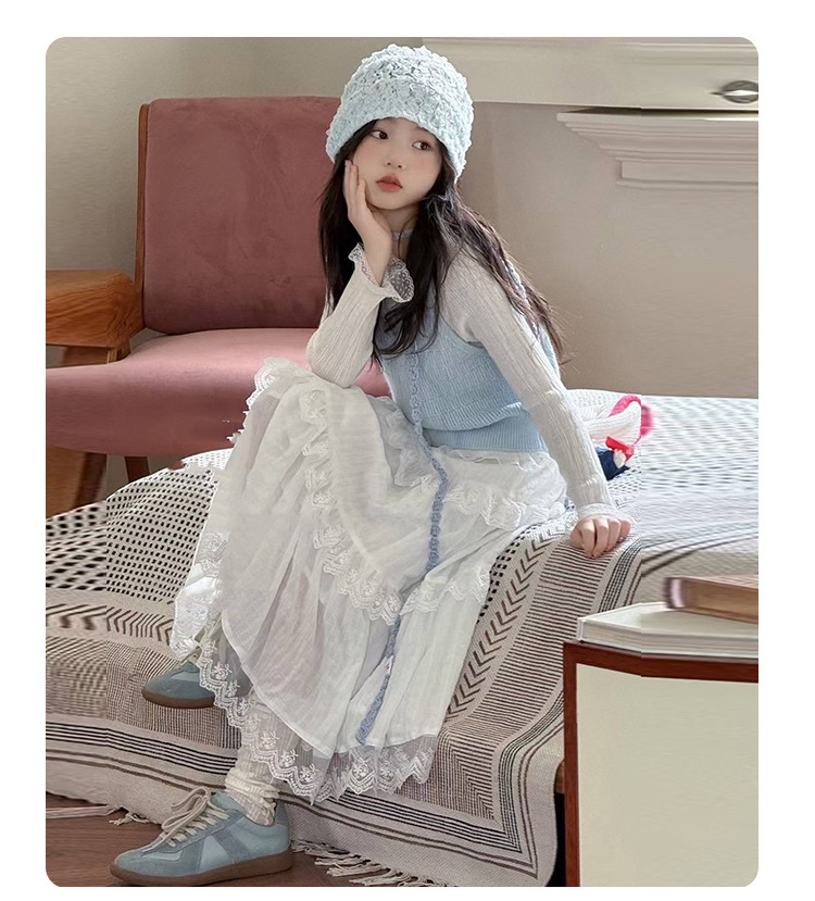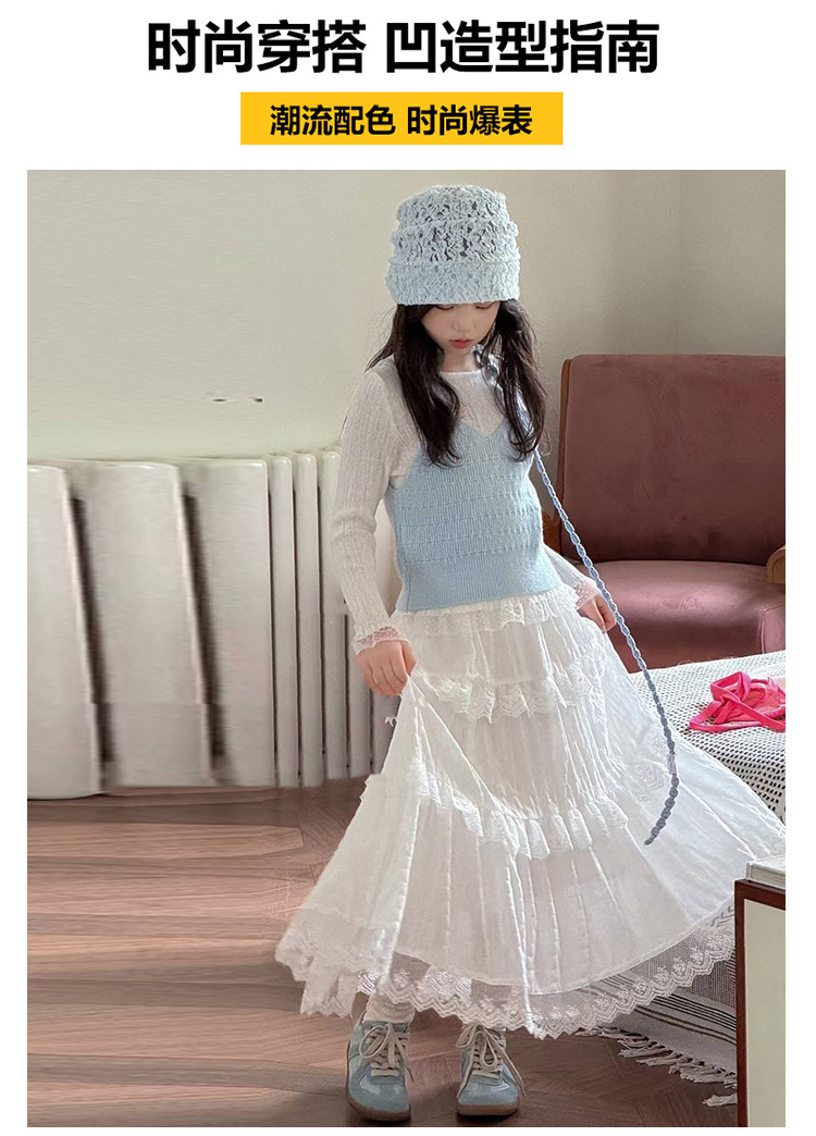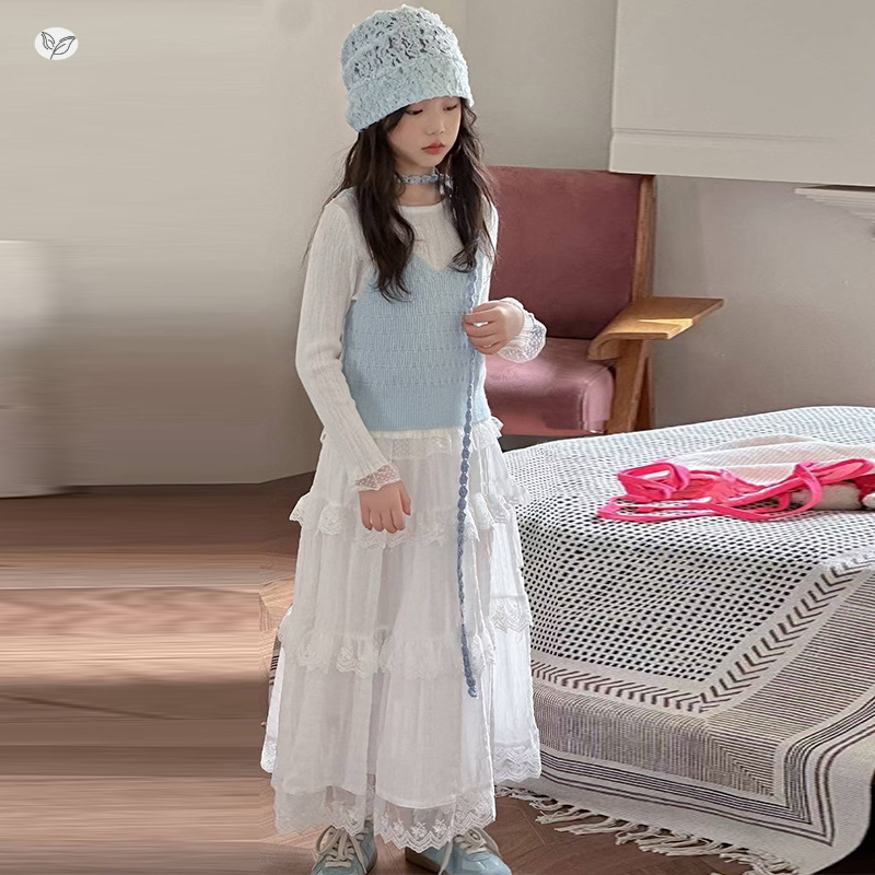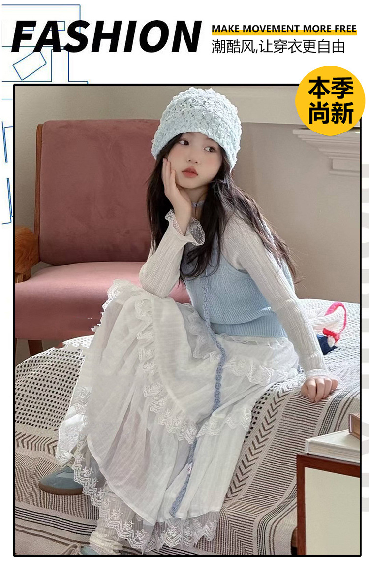 女童早秋裙子套装2025秋季新款吊带背心蕾丝长裙女孩甜美风两件套