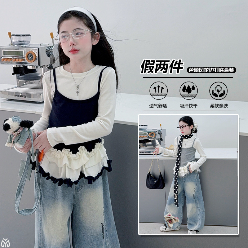 韩系套装假两件吊带拼接T恤女童春款2026新款卡通印花牛仔阔腿裤