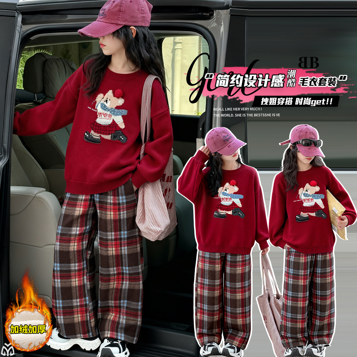 女童加绒加厚套装秋冬装2025新款韩版洋气小女孩毛衣格子裤两件套
