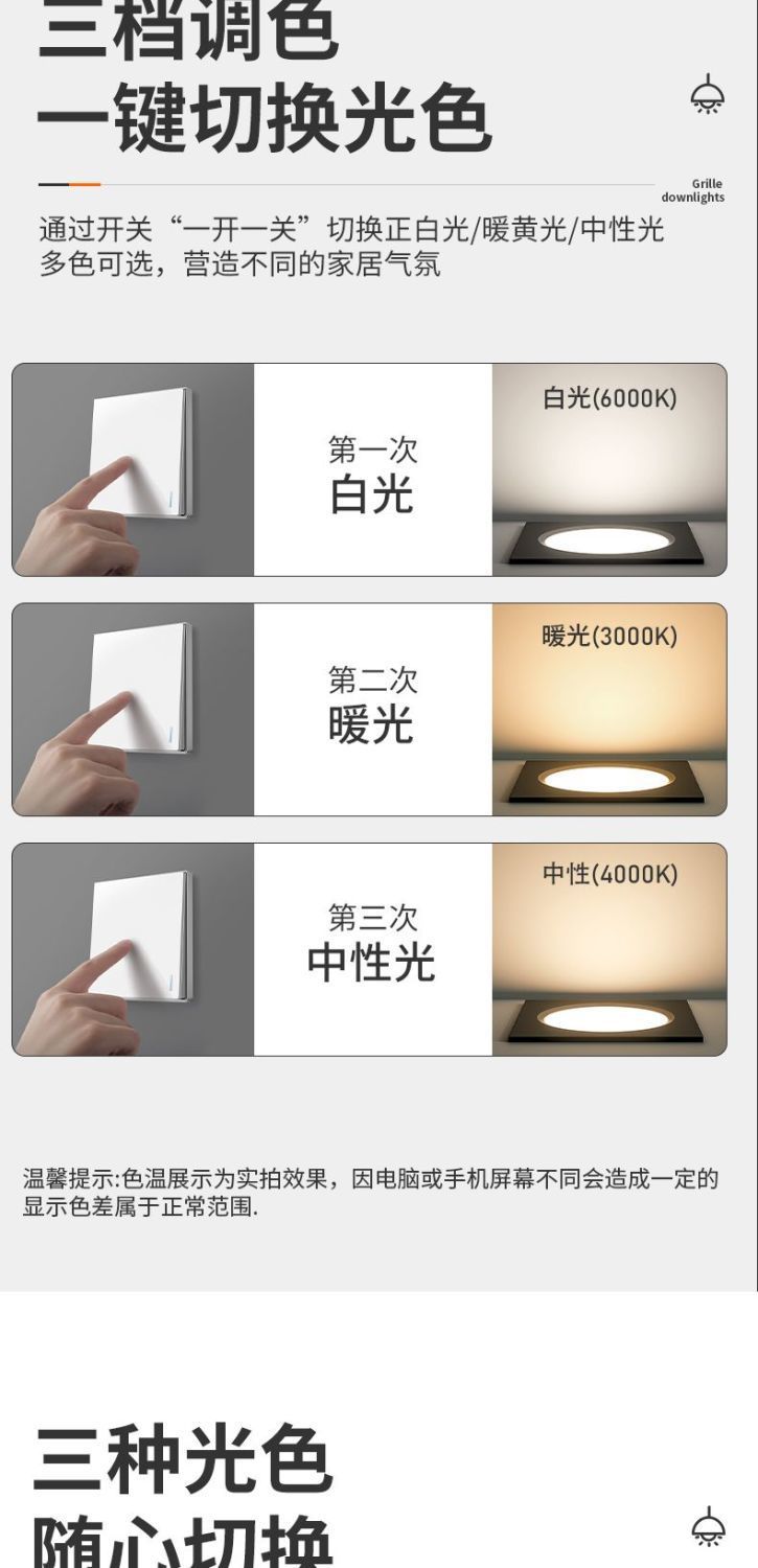 光源功率 暖光3000k,中性光4000k,白光6000k,三色变光