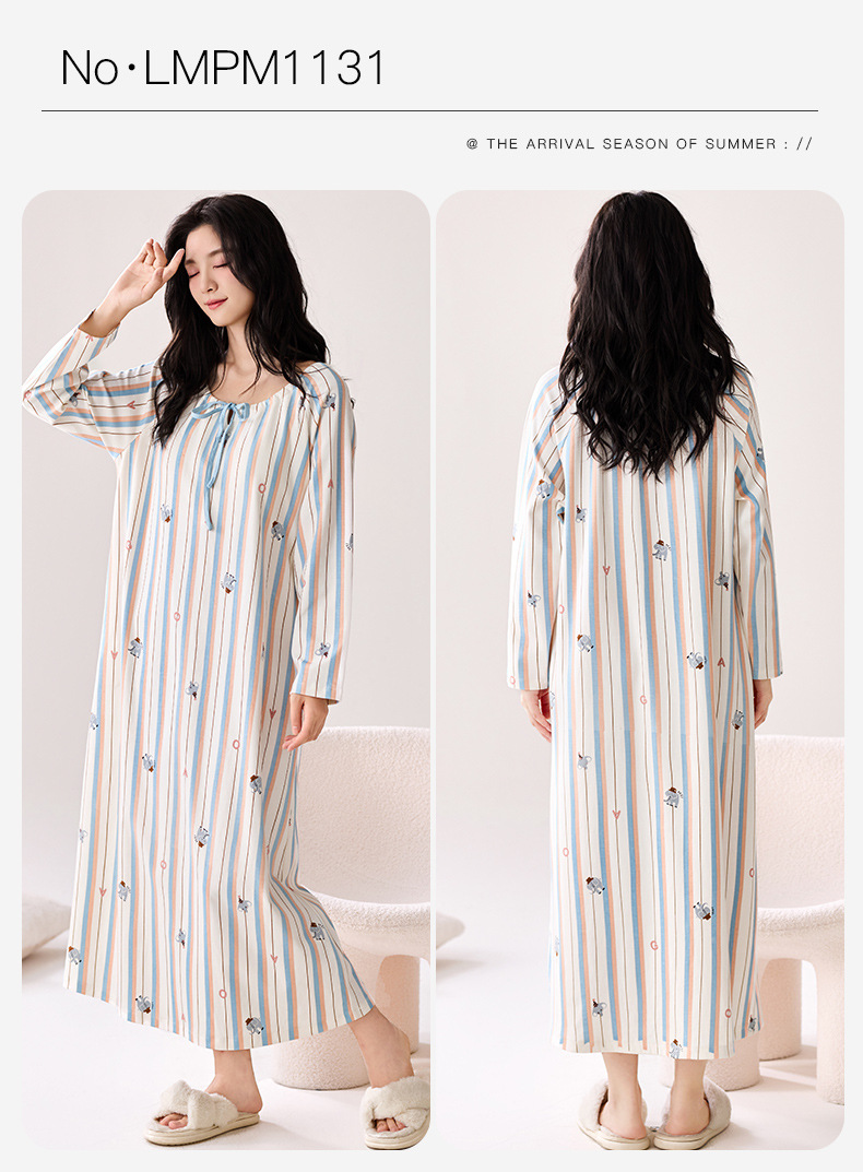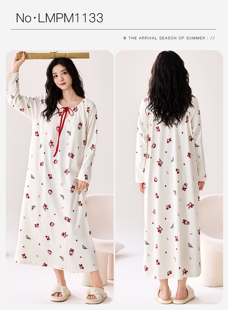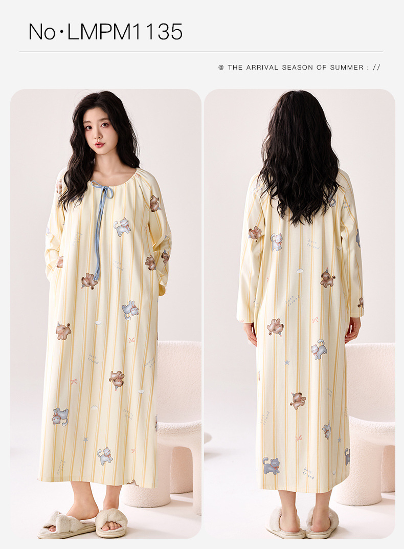 带胸垫纯棉睡裙女新款春秋长袖长裙柔软卡通透气家居服睡衣可外穿