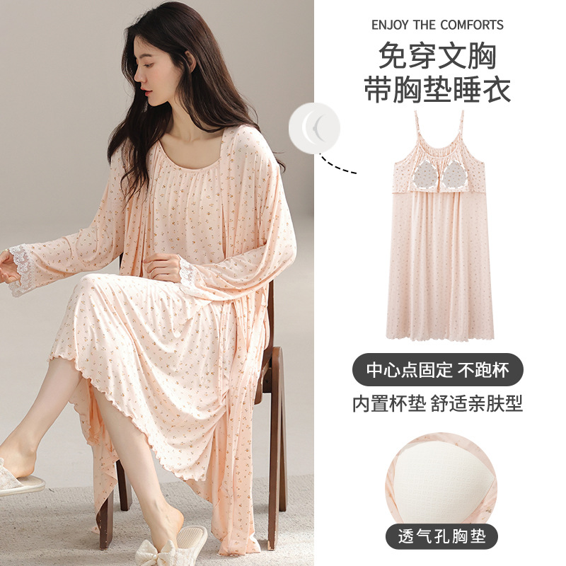 100纯棉睡裙女士秋季中长款2025新款甜美印花带胸垫春秋款家居服