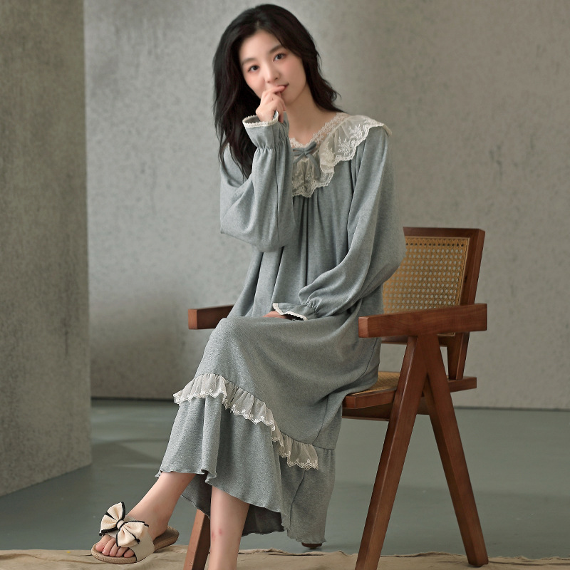 2025新款100纯棉睡衣秋冬季带胸垫长袖中长女士睡裙公主风家居服