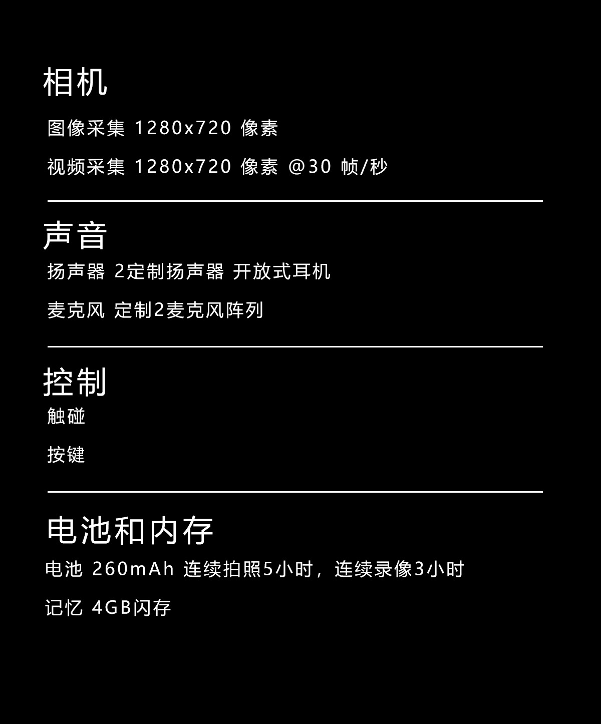 附加功能 AI语音助手/拍照/录视频/录音/音乐控制/通话/提示音/指示灯/翻译/智视识物/触摸/图片视频下载