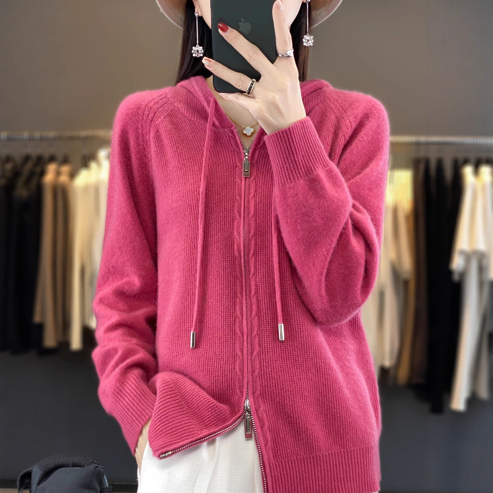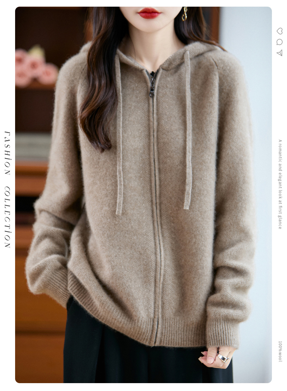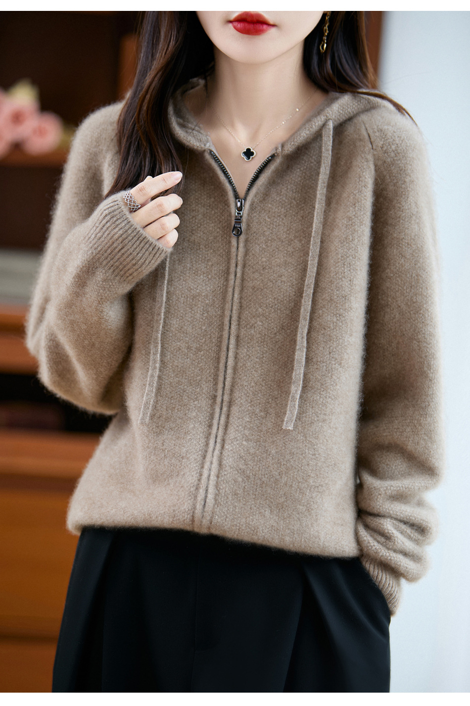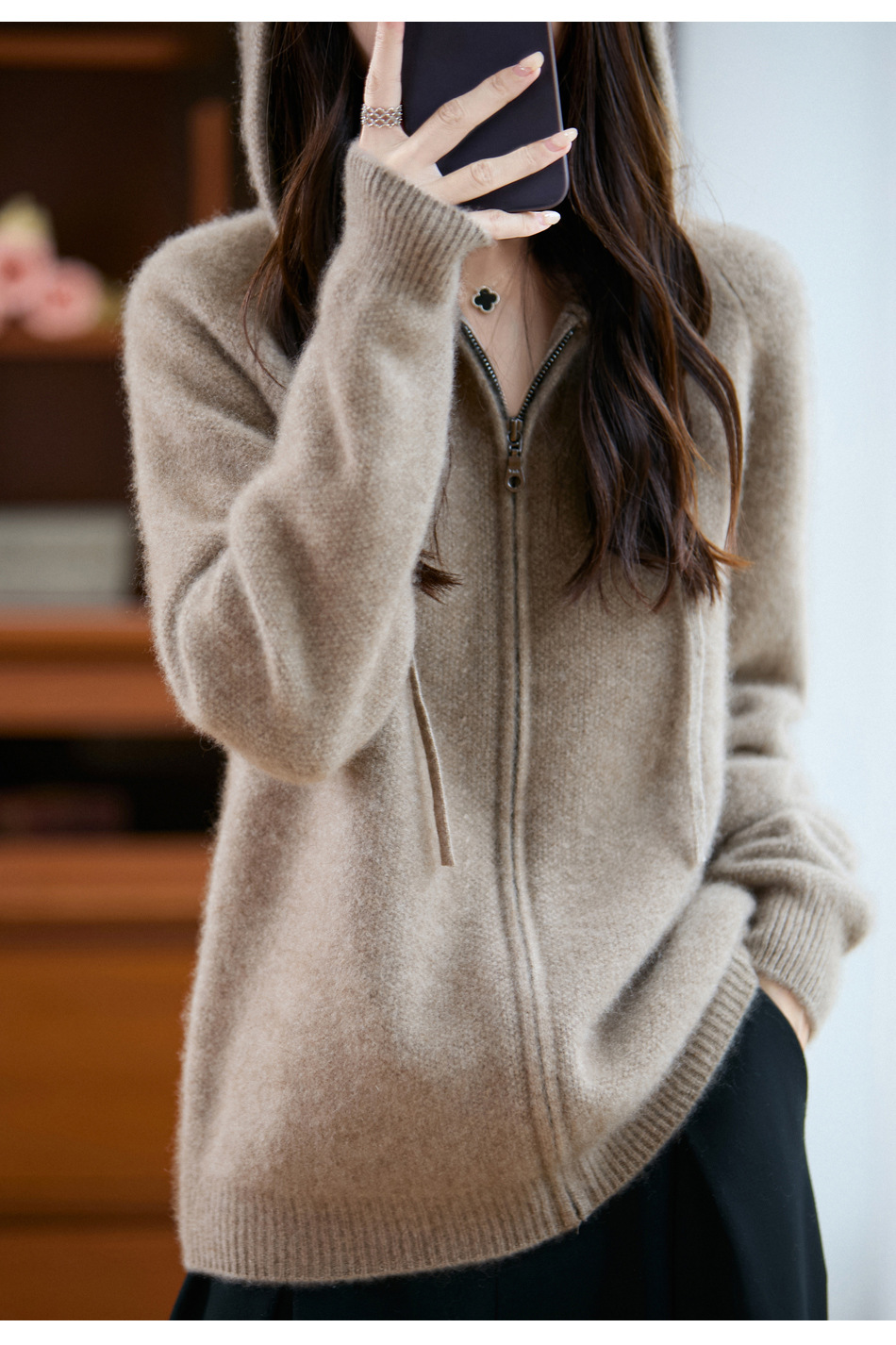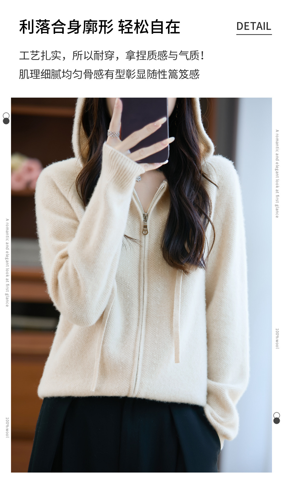 25年新作 純毛レディースフード付きジッパーカーディガン 長袖セーター ゆったりウールセーター ニットジャケット