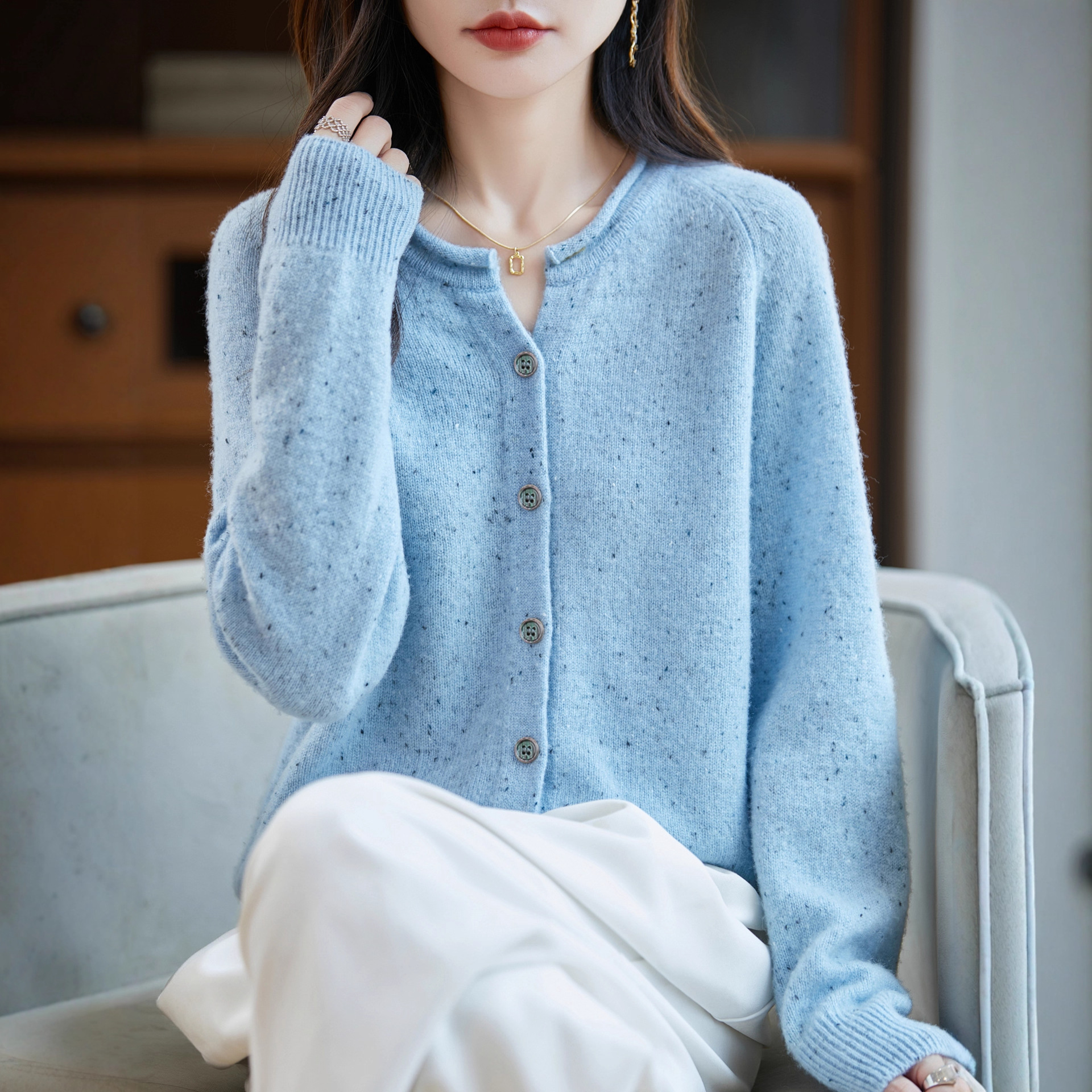 100%纯羊毛加厚卷边彩点纱开衫女 秋冬新款复古宽松慵懒外搭上衣