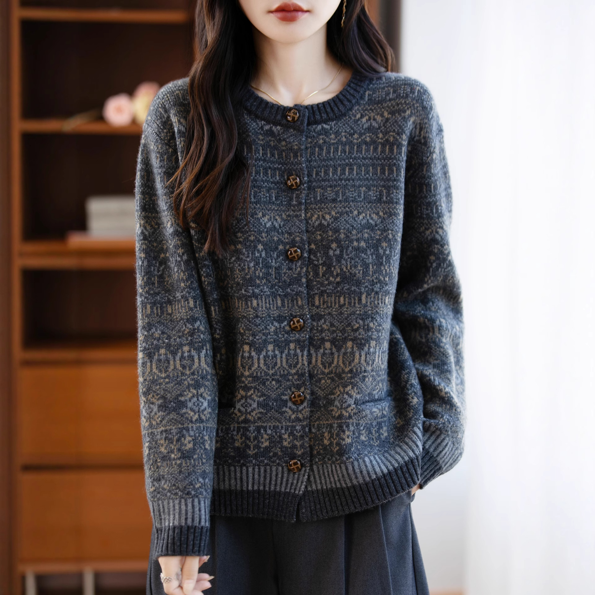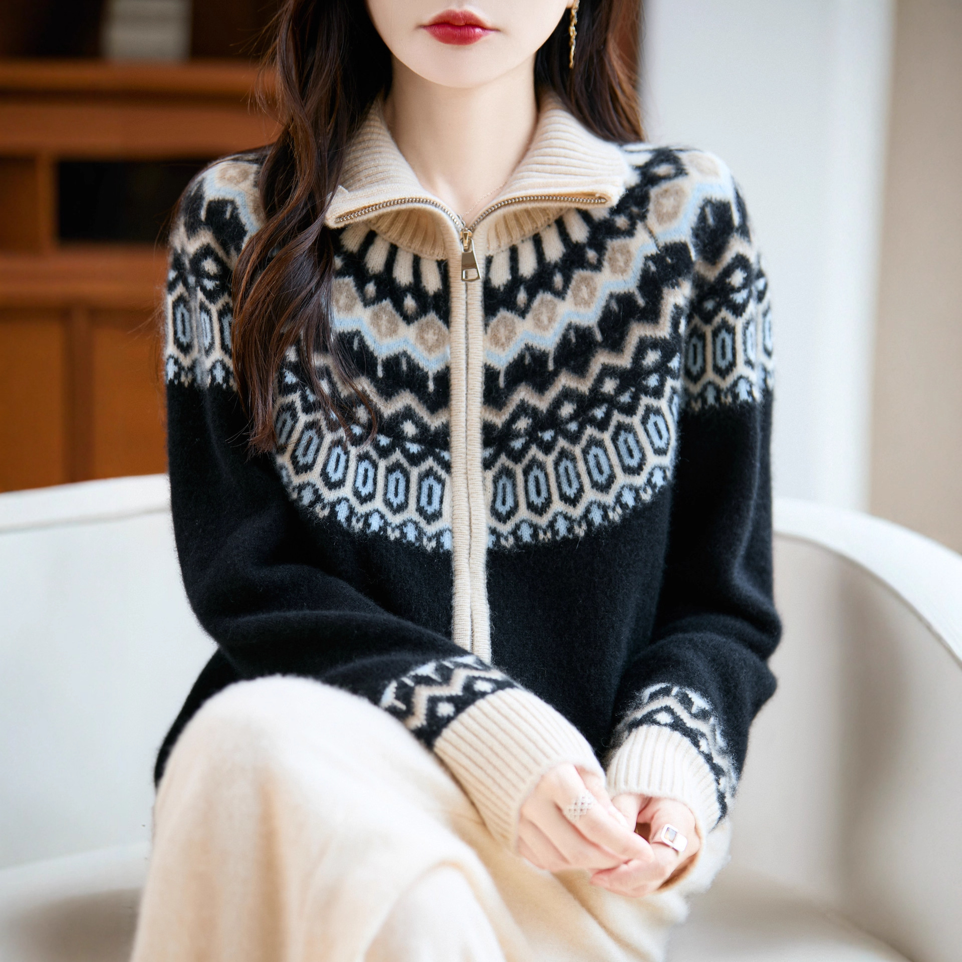 复古双拉链100%羊毛七针加厚费尔岛提花开衫冬季保暖毛衣外套女