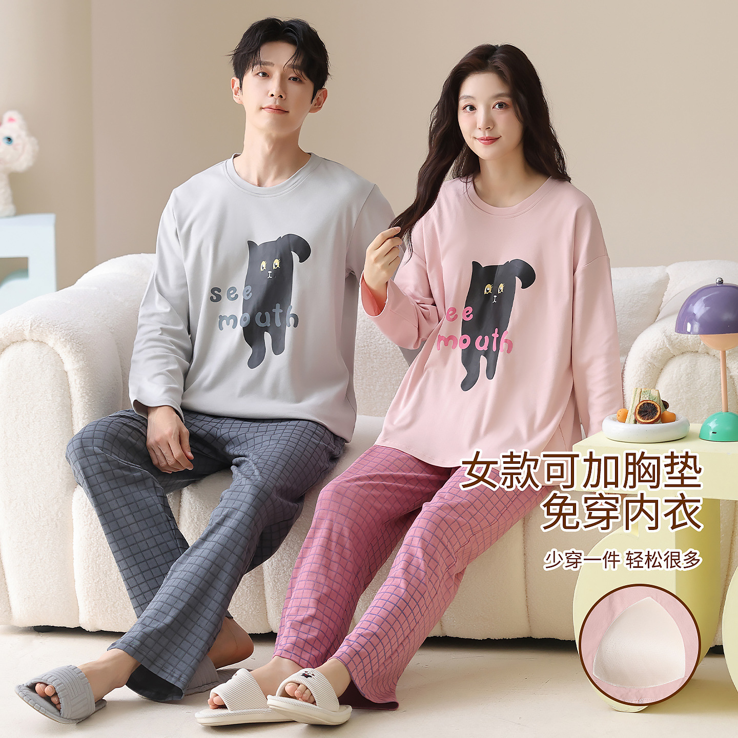 100%情侣睡衣女带胸垫秋季新款长袖长裤可爱卡通男士可外穿家居服
