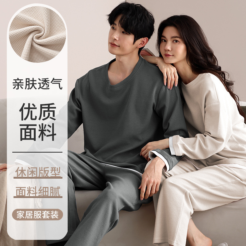 【ワッフル】100% 純綿カップルパジャマ春と秋の長袖セット純色シンプルな男性ルームウェア
