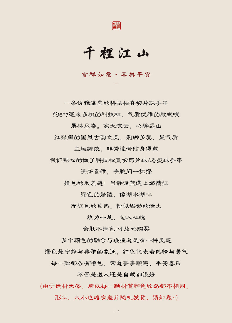 颜色 朱韵色方珠款10.5g【6mm】,珊瑚色药片珠款12.4g【6*3mm】,猛犸色药片珠款13.9g【6*3mm】,青绿色老型珠款【6*5mm】13.3g,青绿色老型珠款17.3g【7*5mm】,青绿色老型珠款21.6g【8*6mm】