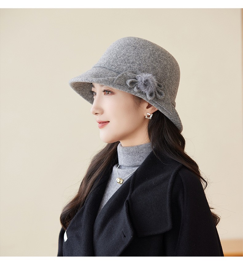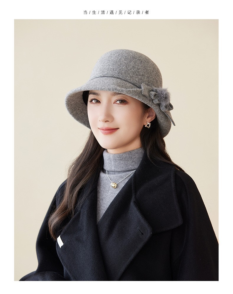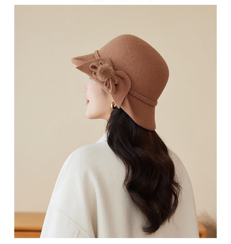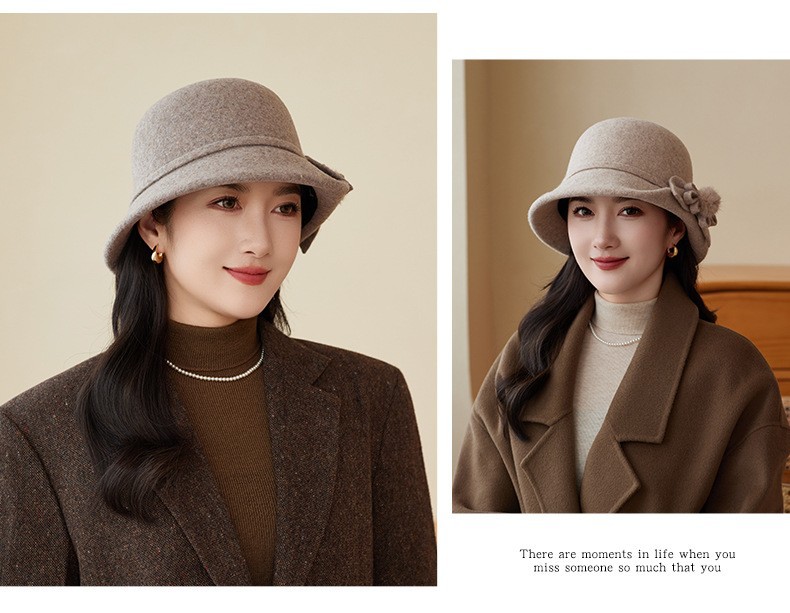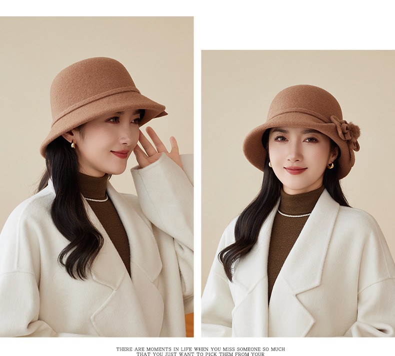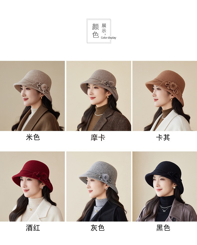 秋冬季保暖羊毛盆帽复古赫本风花朵气质渔夫帽女士优雅毛呢帽子潮