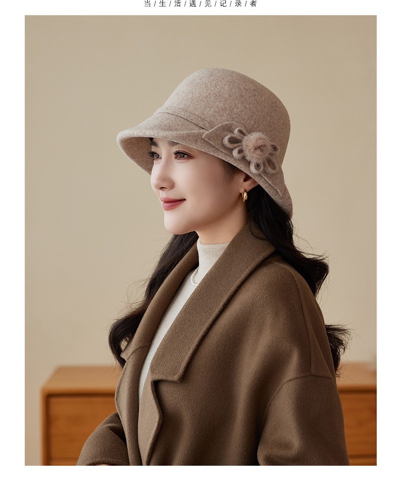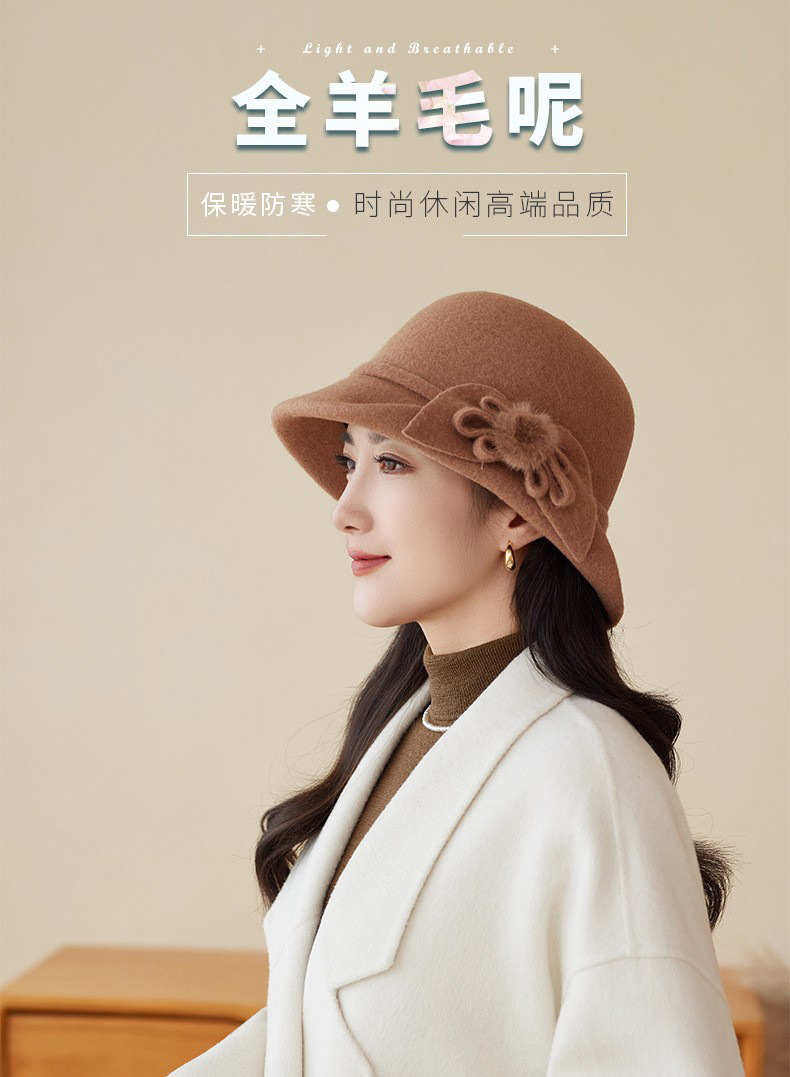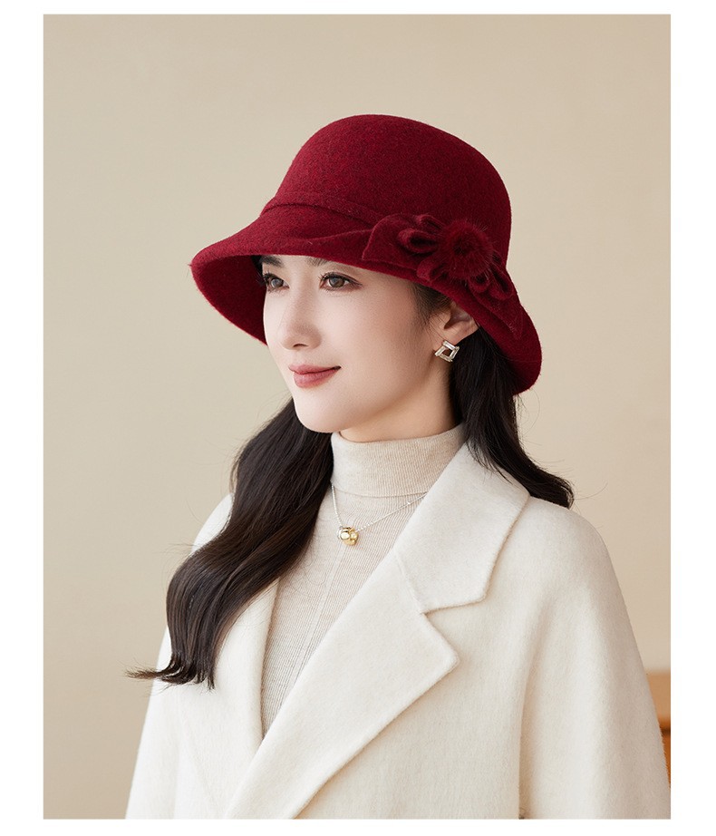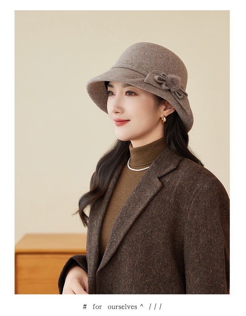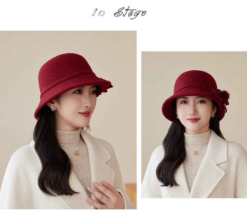 秋冬季保暖羊毛盆帽复古赫本风花朵气质渔夫帽女士优雅毛呢帽子潮