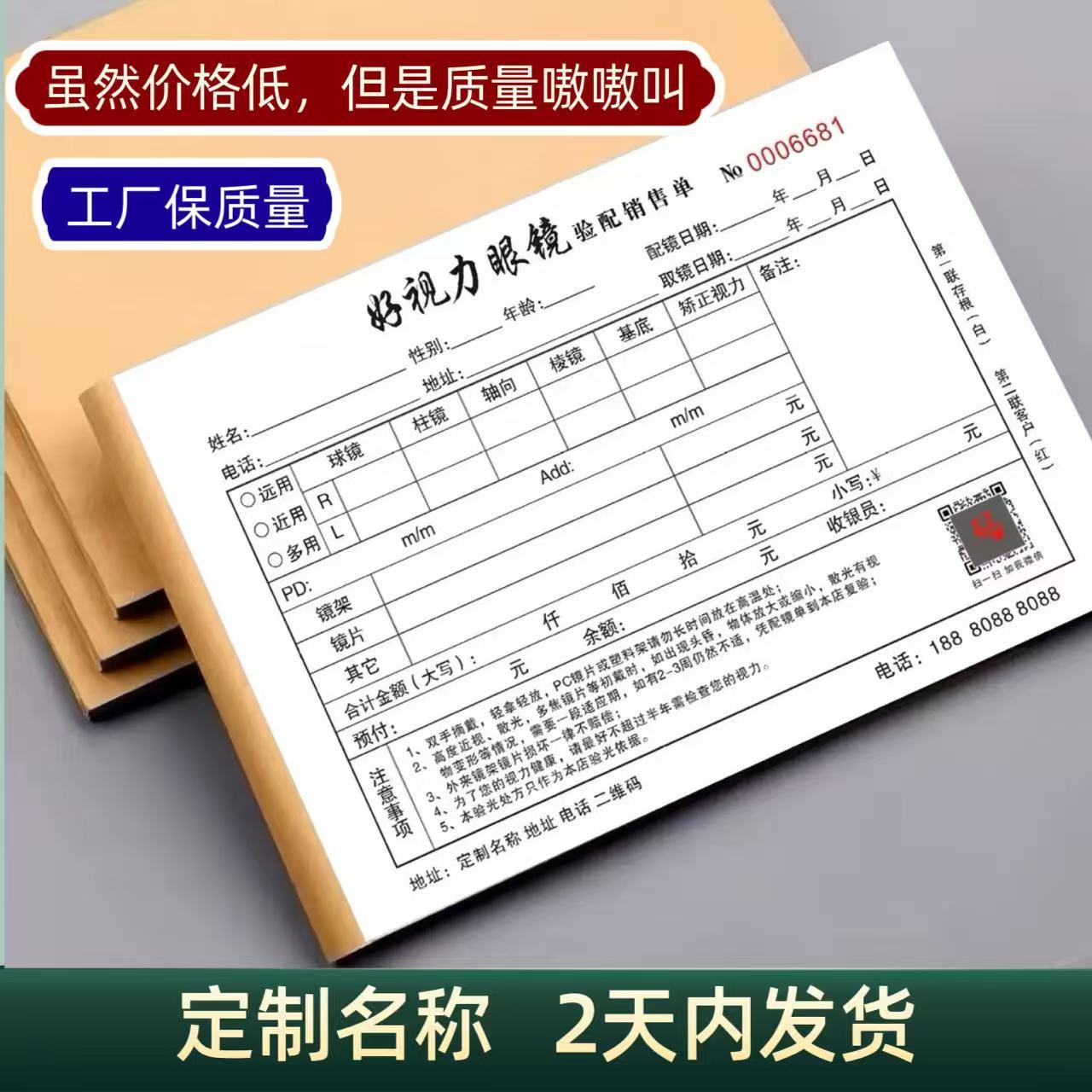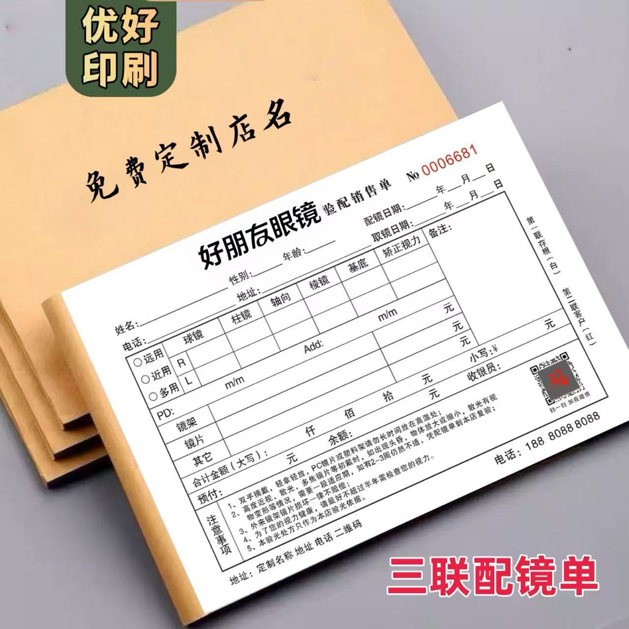 50冊送料無料、カスタムメイド32開き二重・三重無炭素複写処方箋検眼表、眼科医院・眼鏡店用メガネ注文書