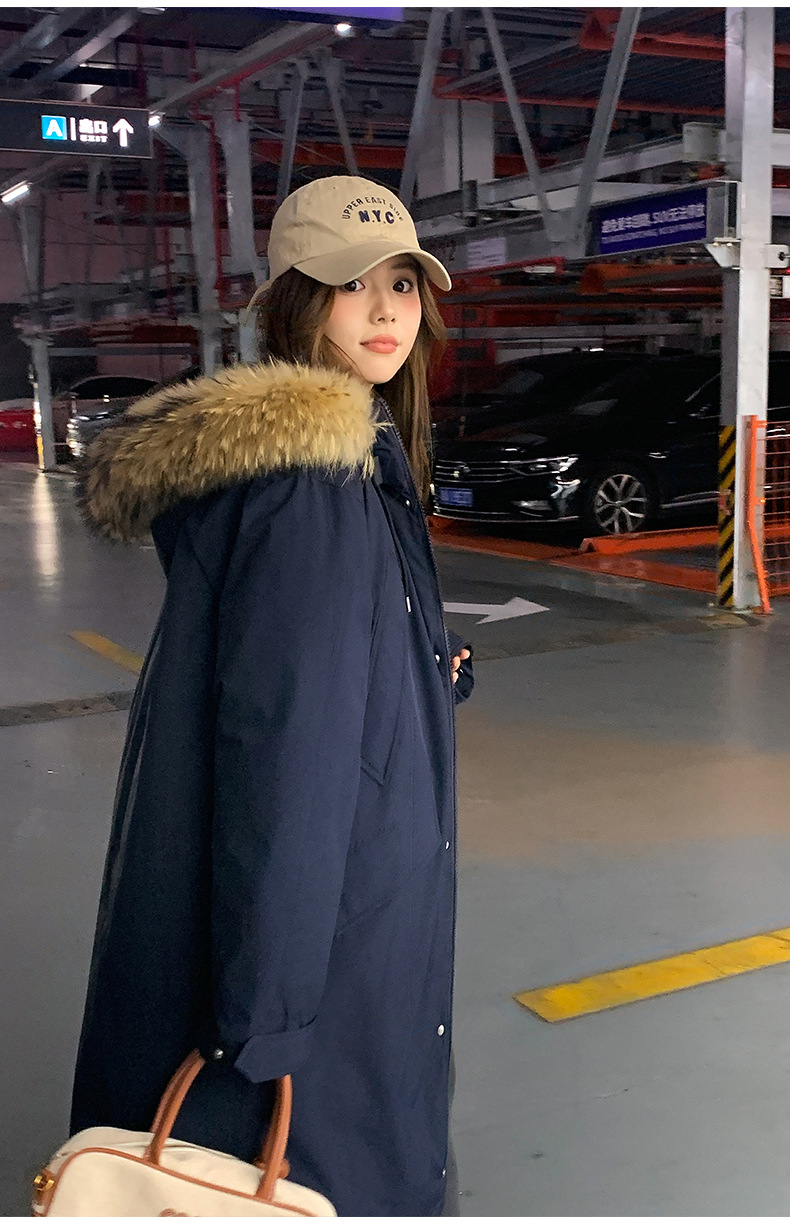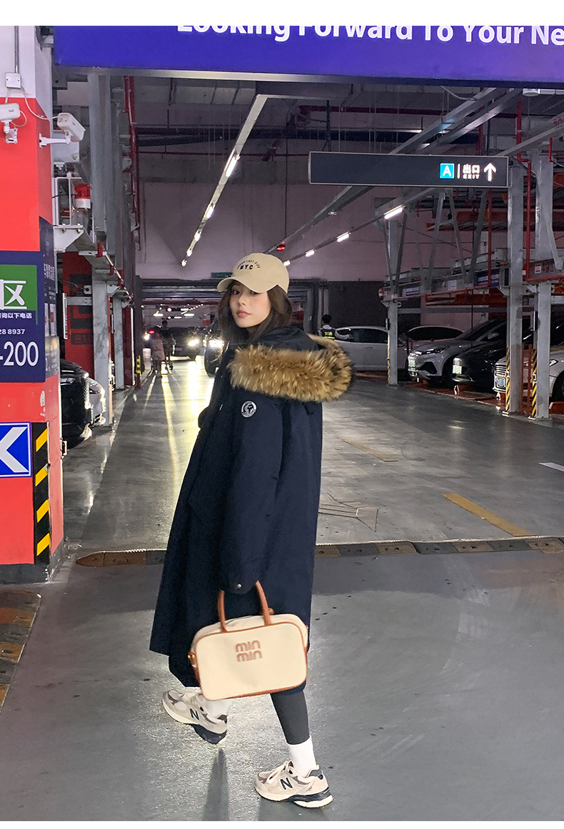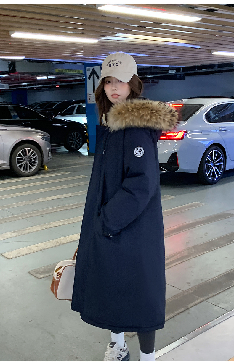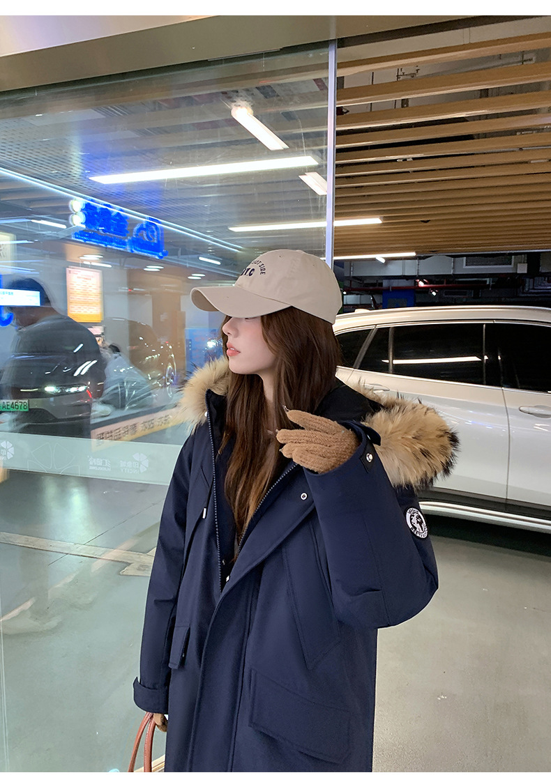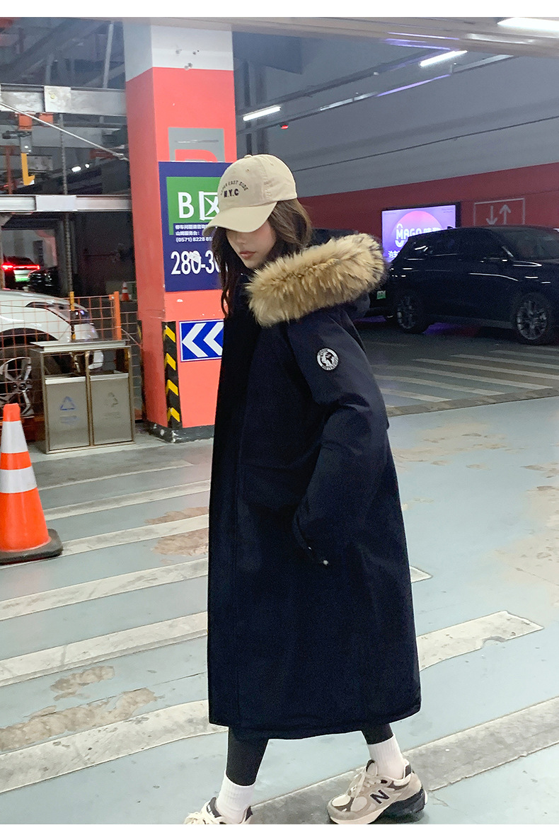 藏青色中长款工装派克羽绒棉服女2025冬季新款加厚宽松大毛领棉衣