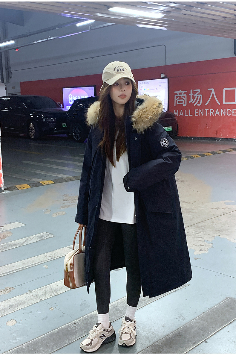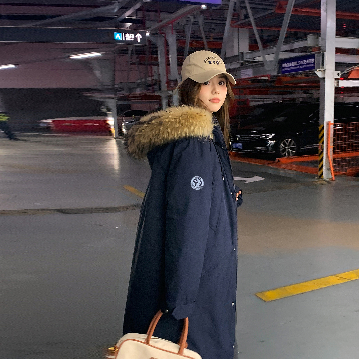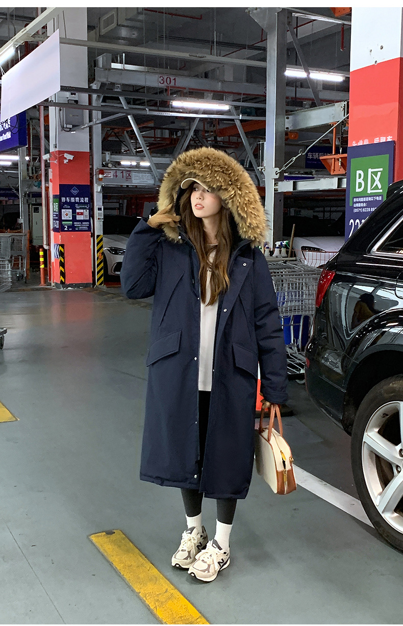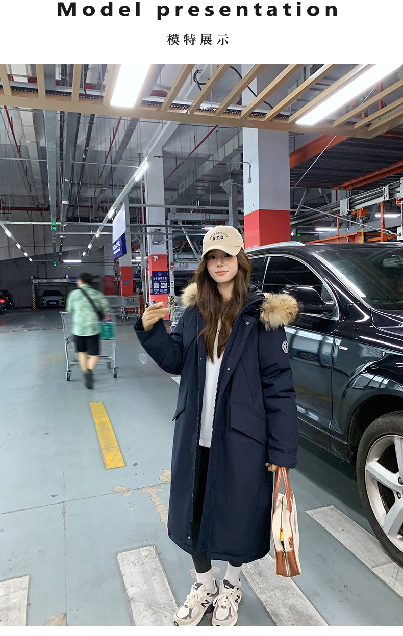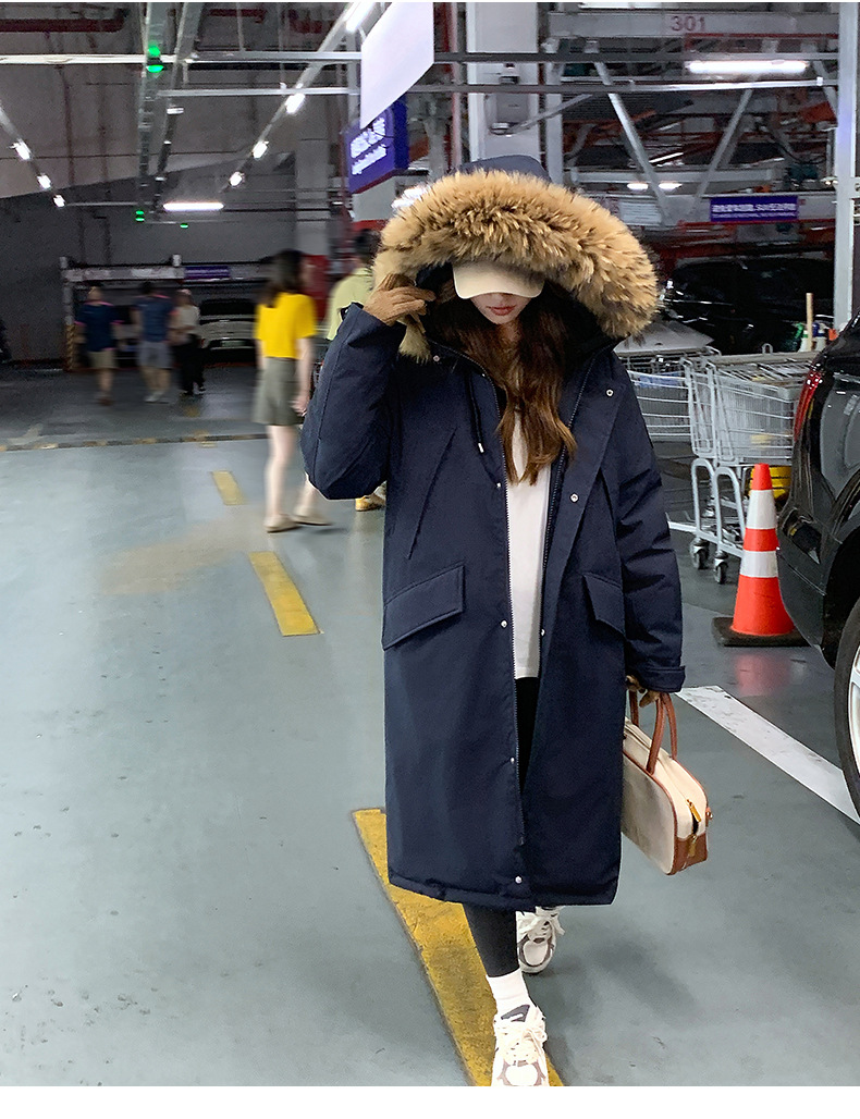 藏青色中长款工装派克羽绒棉服女2025冬季新款加厚宽松大毛领棉衣