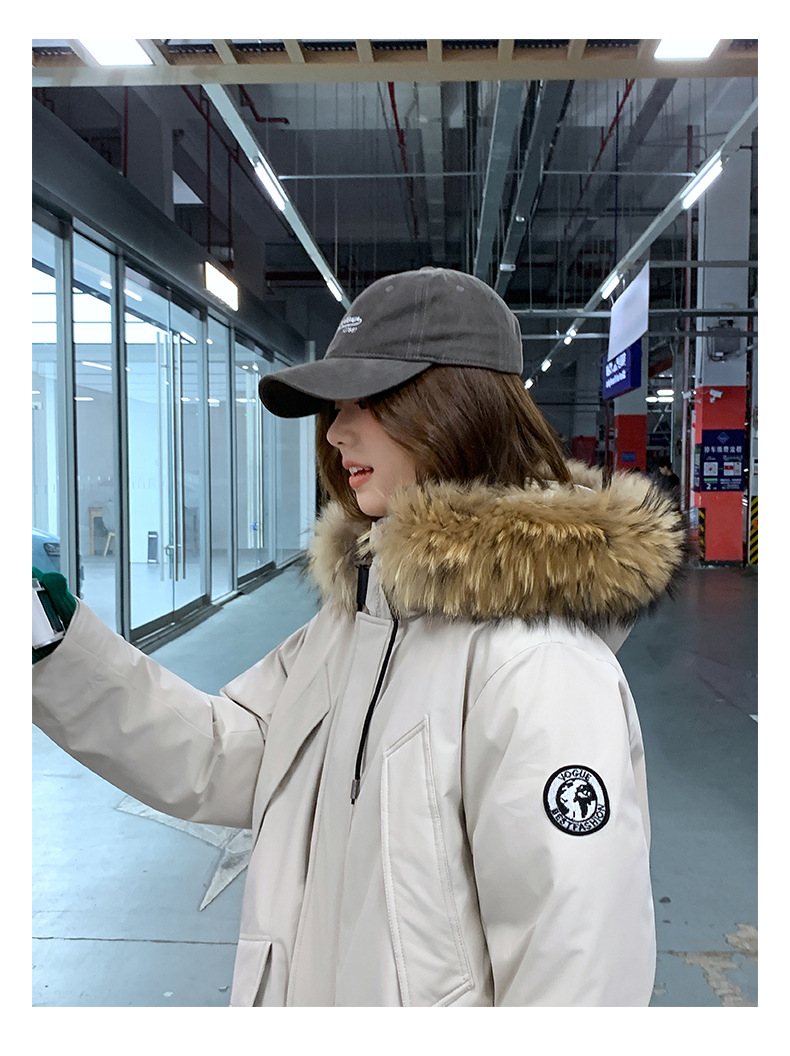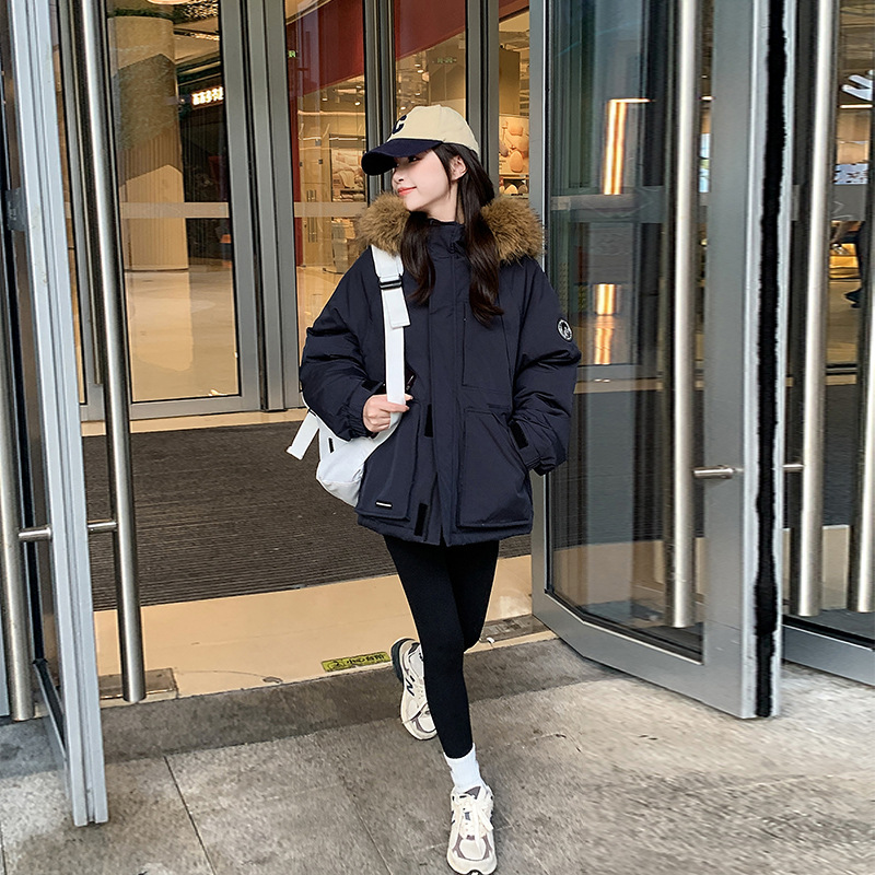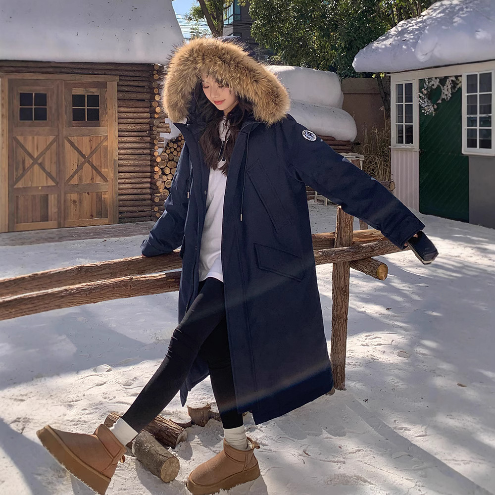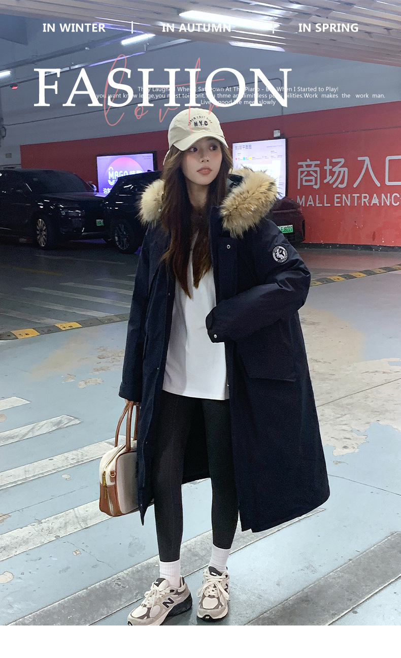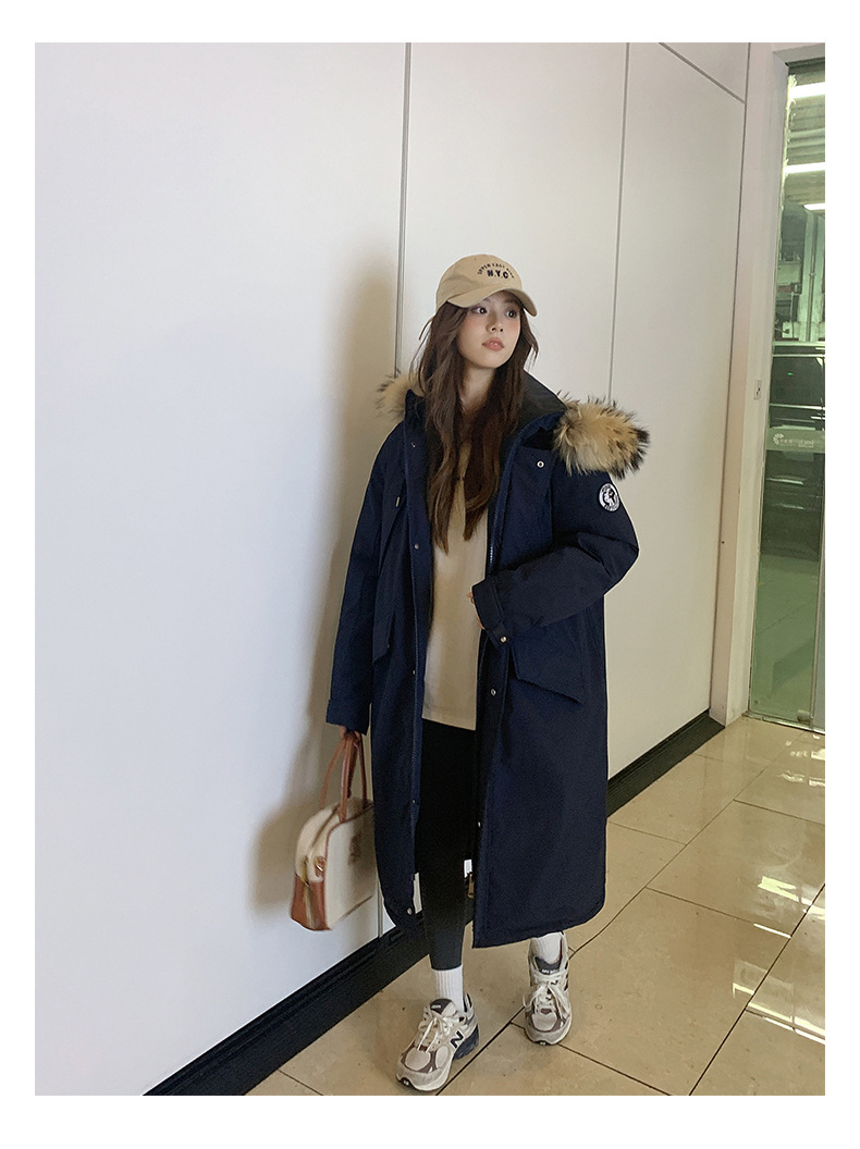 藏青色中长款工装派克羽绒棉服女2025冬季新款加厚宽松大毛领棉衣
