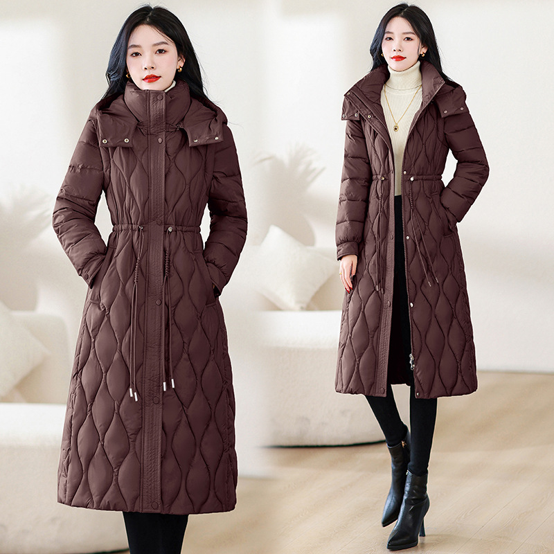 2025秋冬新款长款过膝加厚大码时尚休闲连帽纯色棉服外套女
