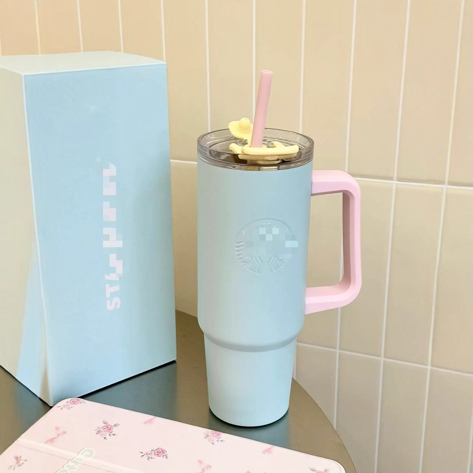 星爸爸蓝色晶粉色冰霸杯吸管杯高颜值大容量不锈钢水杯带手柄