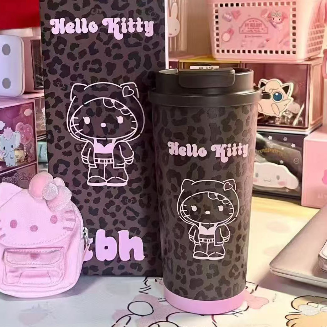 野兽派欧阳娜娜同款黑皮豹纹HelloKitty巨无霸保温吸管不锈钢水杯