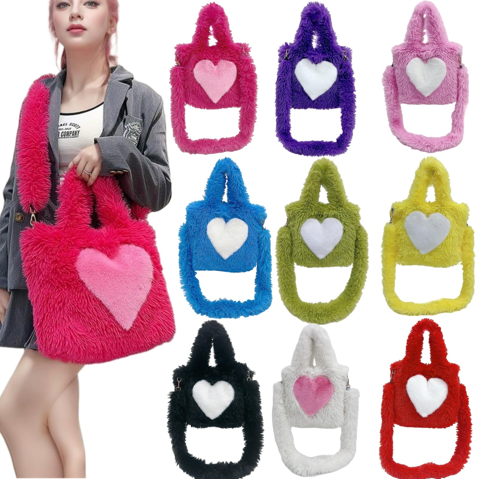 外国貿易 2025 新しい毛皮のようなバッグの女性のハート型のパターン大容量ぬいぐるみトートバッグインターネットセレブカジュアルショルダーバッグ