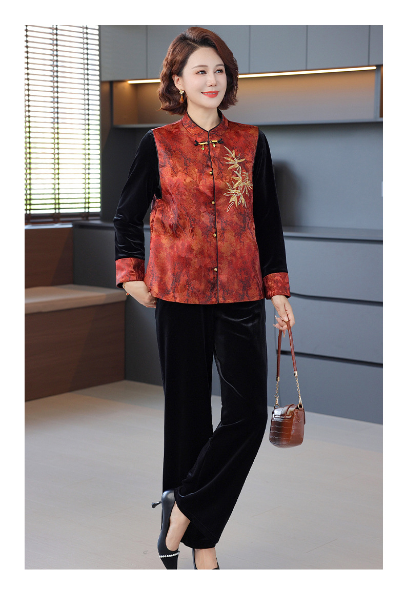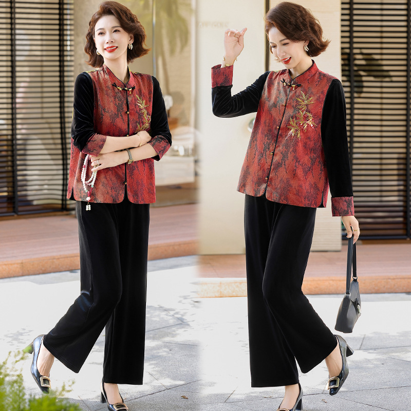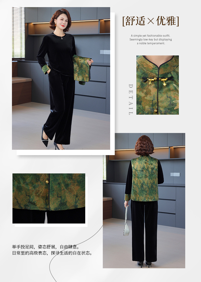 批发秋季中式国风马夹打底衫直筒裤三件套中老年妈妈装丝绒套装