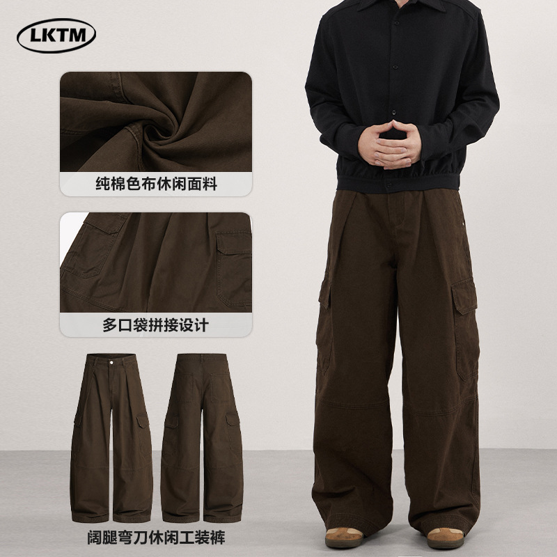 LKTM男装 美式复古水洗廓形工装裤男女宽松阔腿cargo休闲弯刀长裤