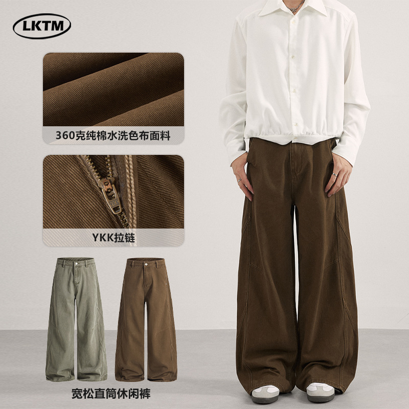 LKTM男装 美式复古解构设计水洗休闲裤男女宽松褶皱直筒垂感裤子