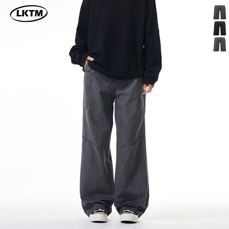 LKTM メンズウェア アメリカンレトロウォッシュ加工ジーンズ 男女兼用 クリーンフィット トレンドブランド ルーズストレートスリムフィットロングパンツ