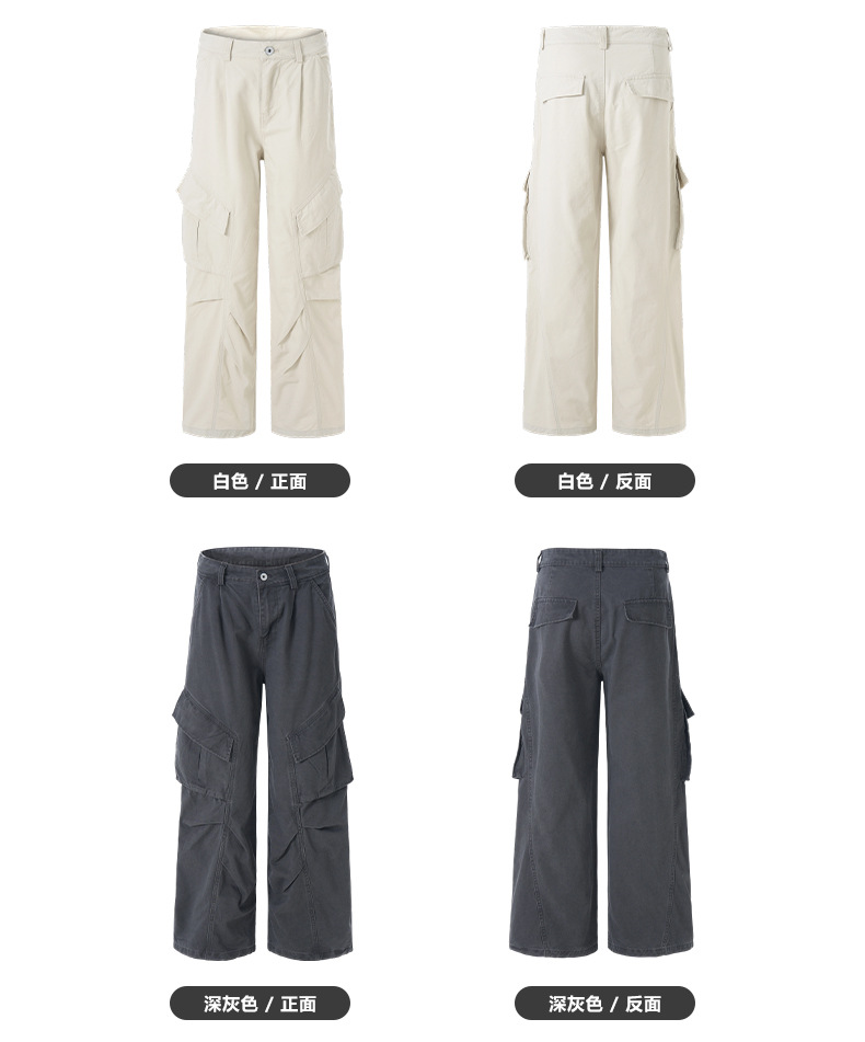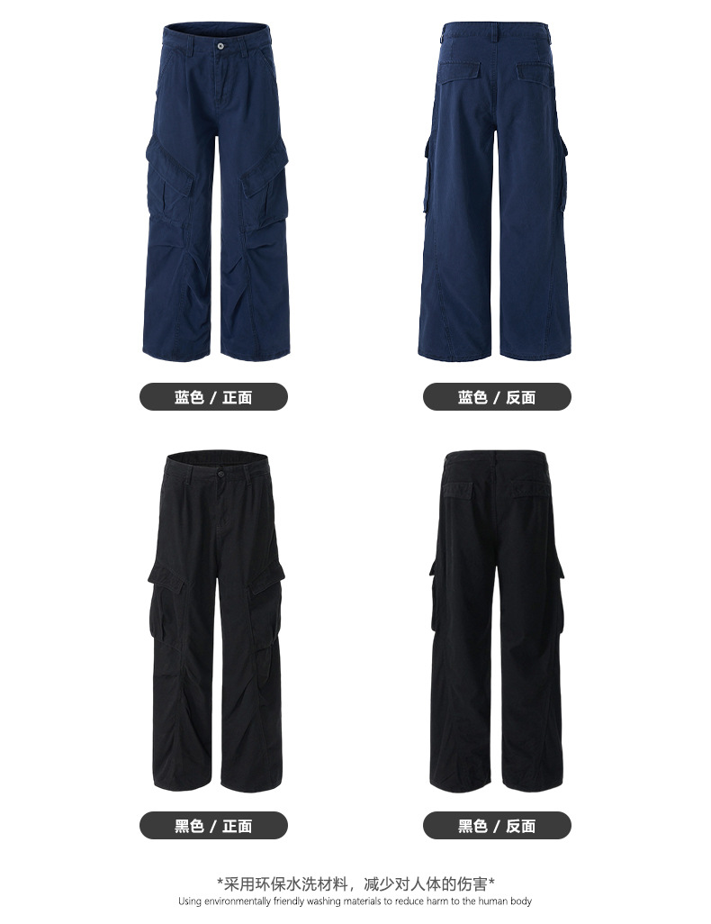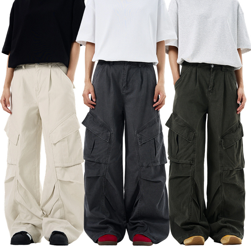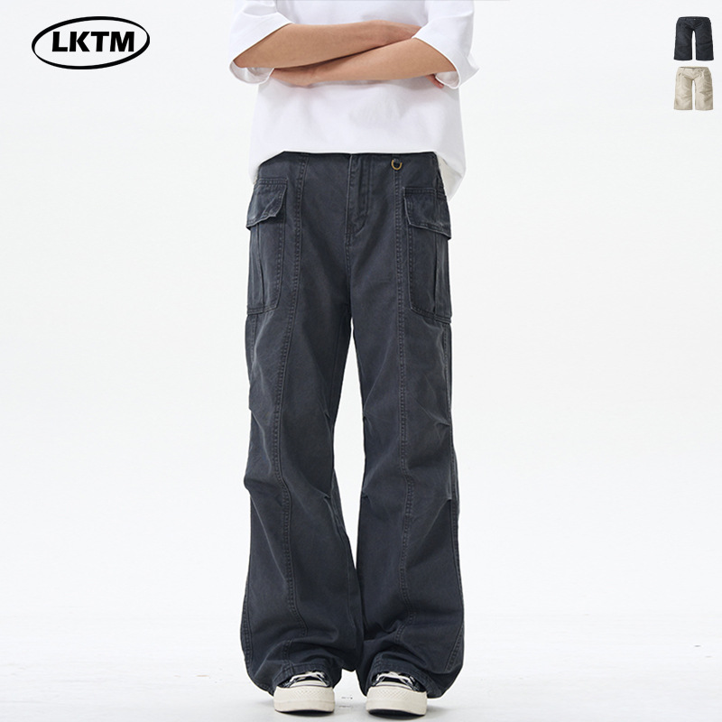 LKTM男装 美式复古vintage多口袋拼接褶皱工装裤男女潮牌阔腿长裤