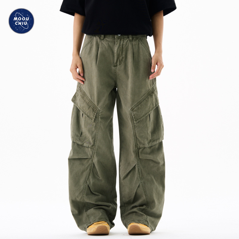 Muqiu メンズウェア | アメリカのトレンディなストリートレトロウォッシュオーバーオール、男性と女性用、ルーズワイドレッグカジュアルパンツ