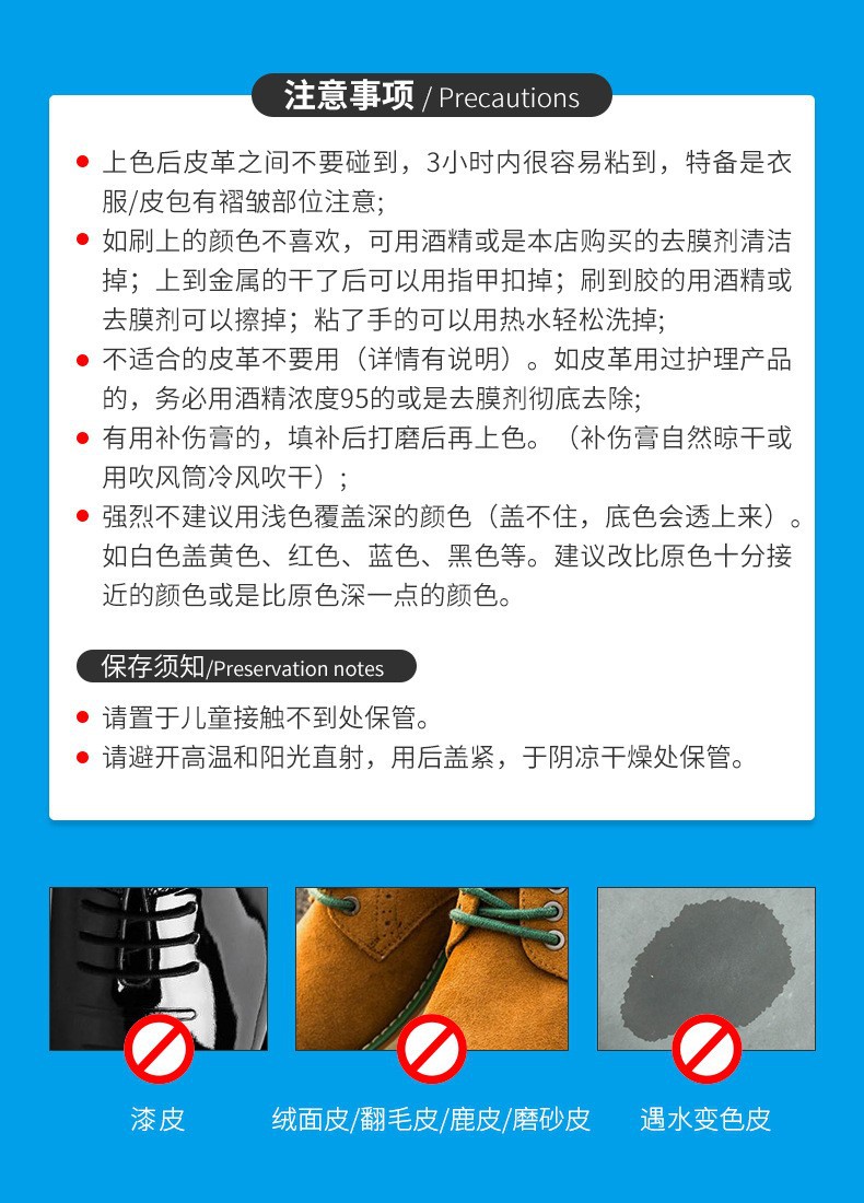 温馨提示 不适用于:绒面皮、翻毛皮、鹿皮、磨砂皮、漆皮、遇水变色皮