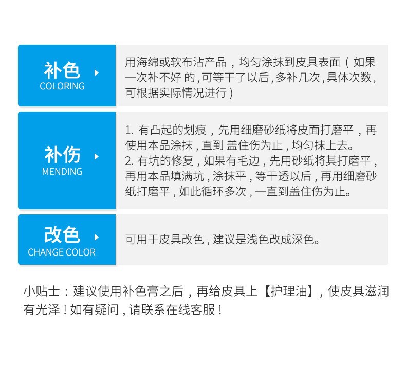 适用于沙发革、鞋革普通的刮伤、龟裂情况,如刀伤等需用砂纸
