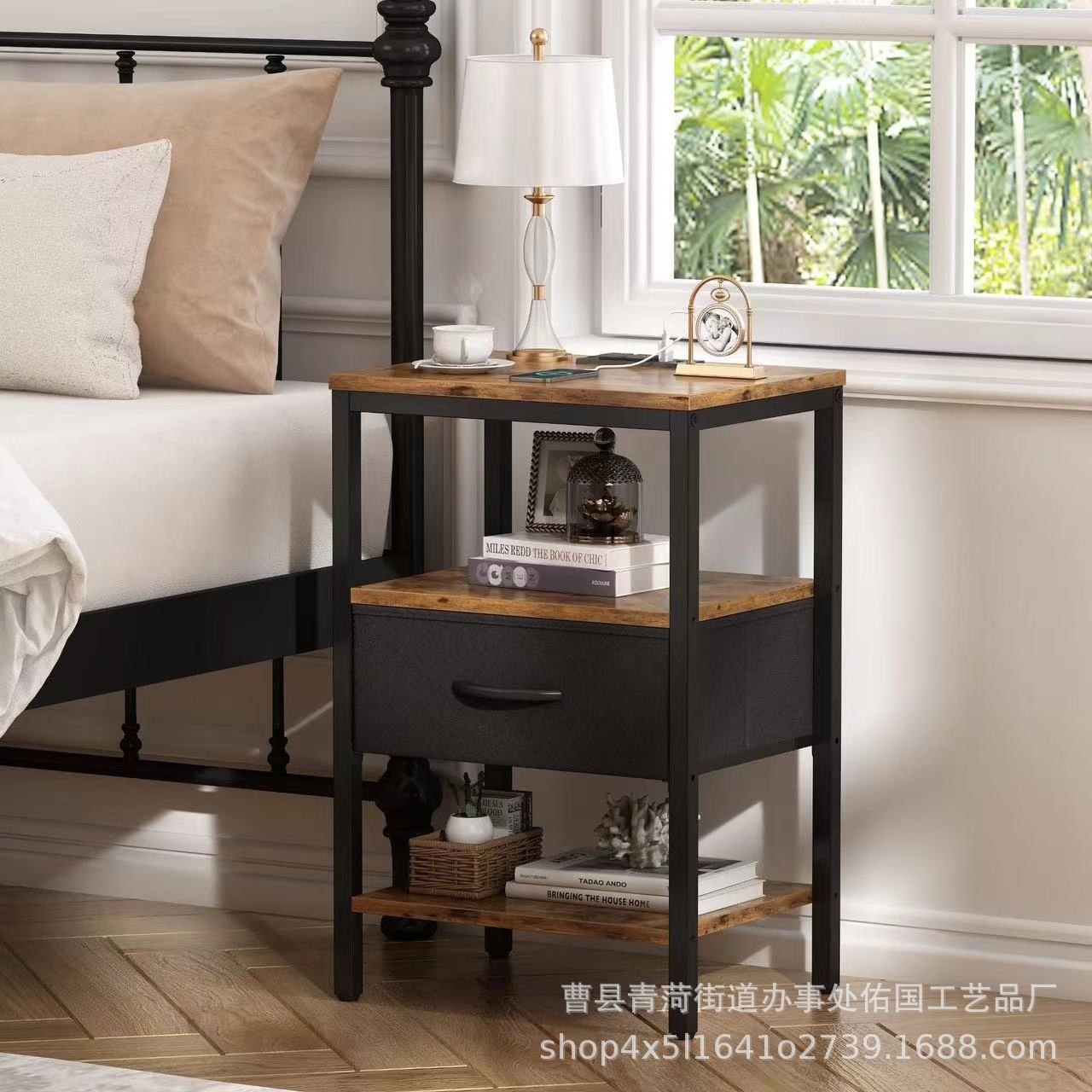 复古铁木结合带抽屉床头柜充电式家用床边收纳边桌卧室置物储物柜