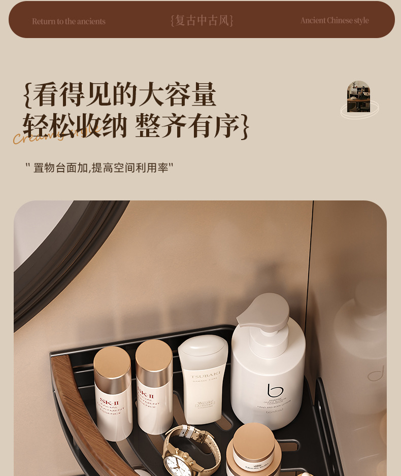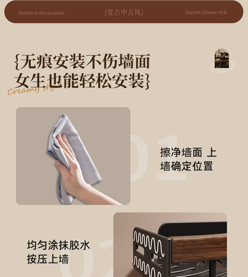 胡桃木卫生间置物架免打孔厕所壁挂中古风浴室洗漱台洗手间收纳架