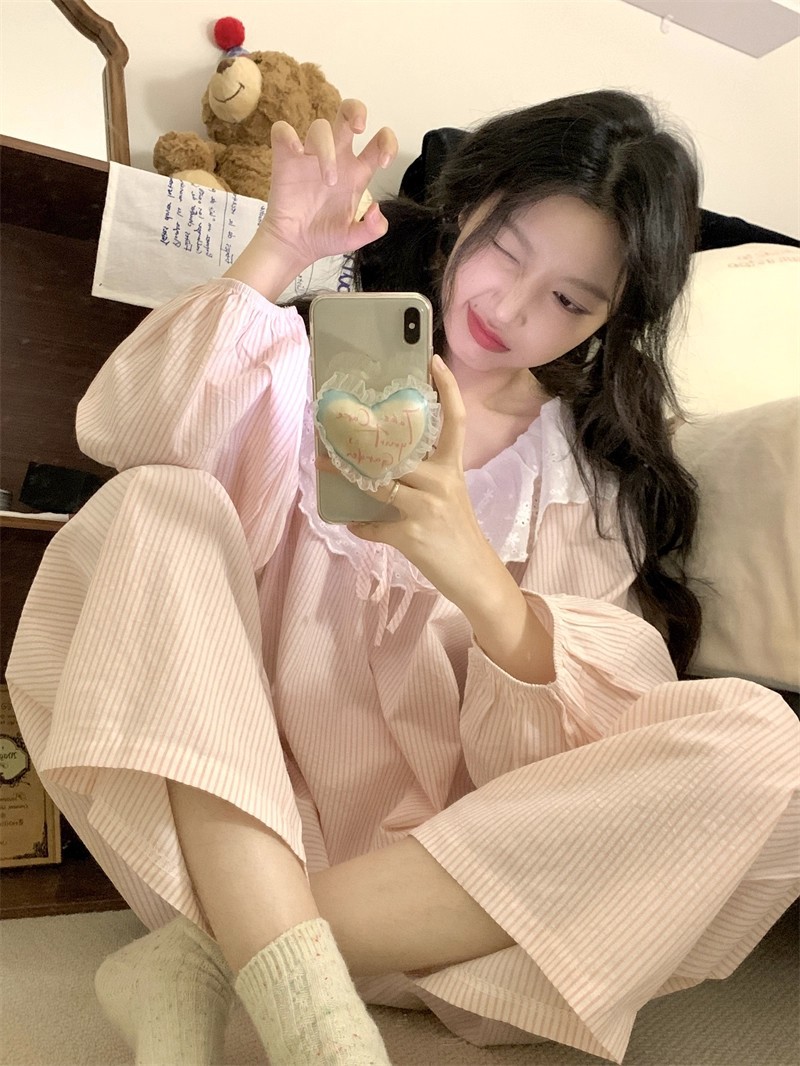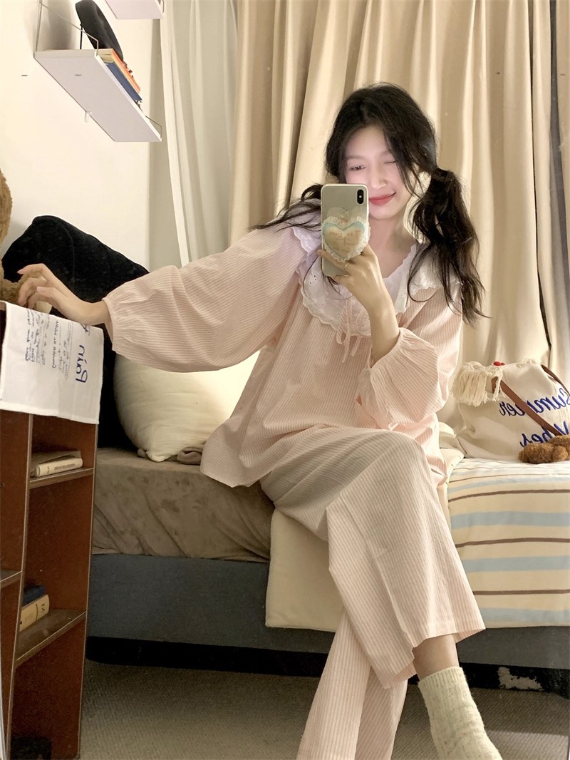 韩版条纹睡衣女春秋季长袖套装大码网红风云朵棉纱布家居服可外穿