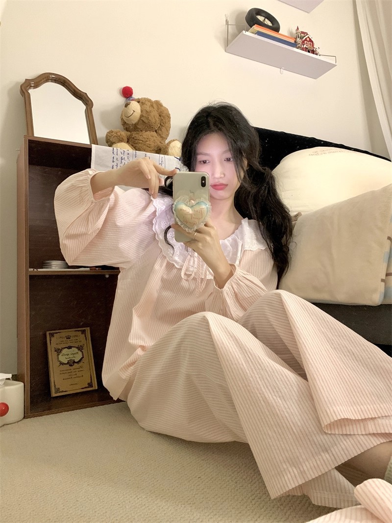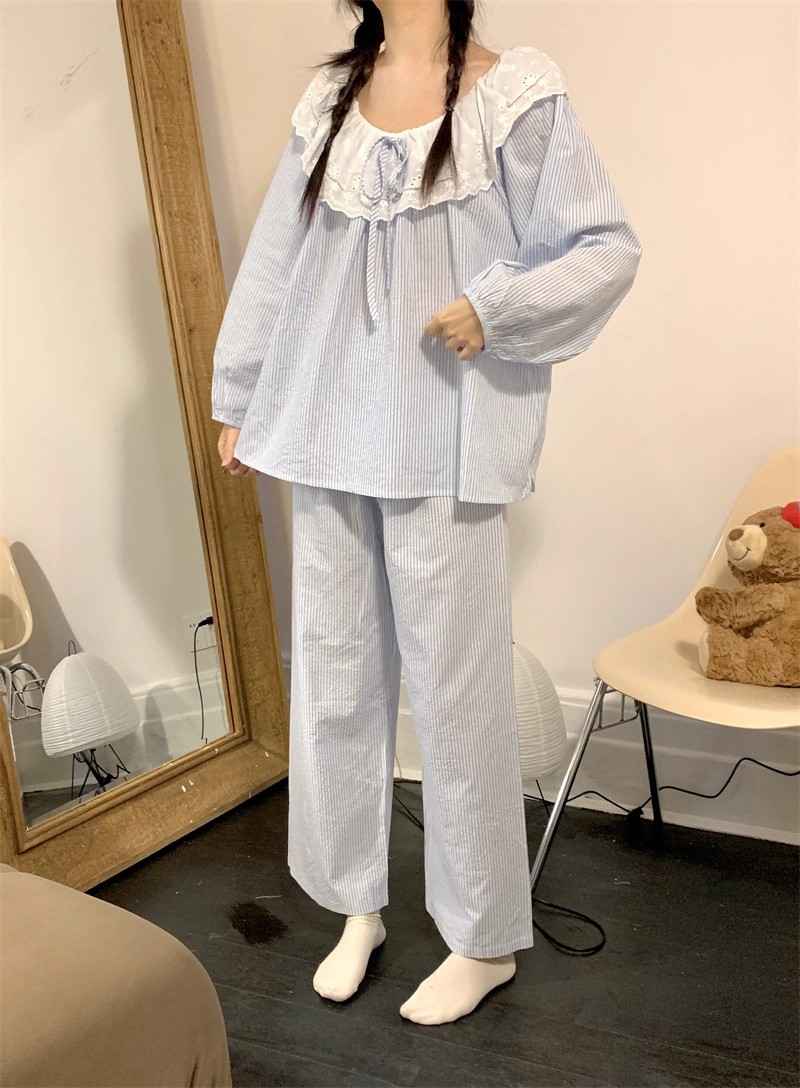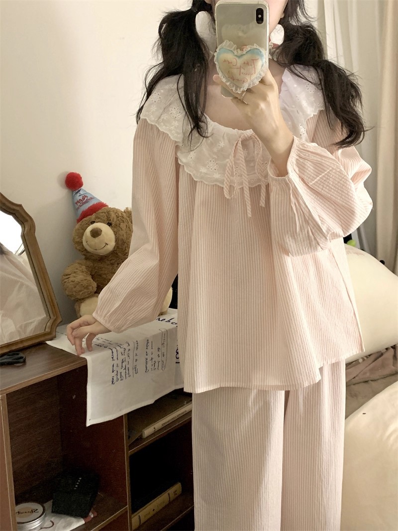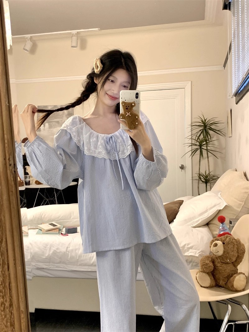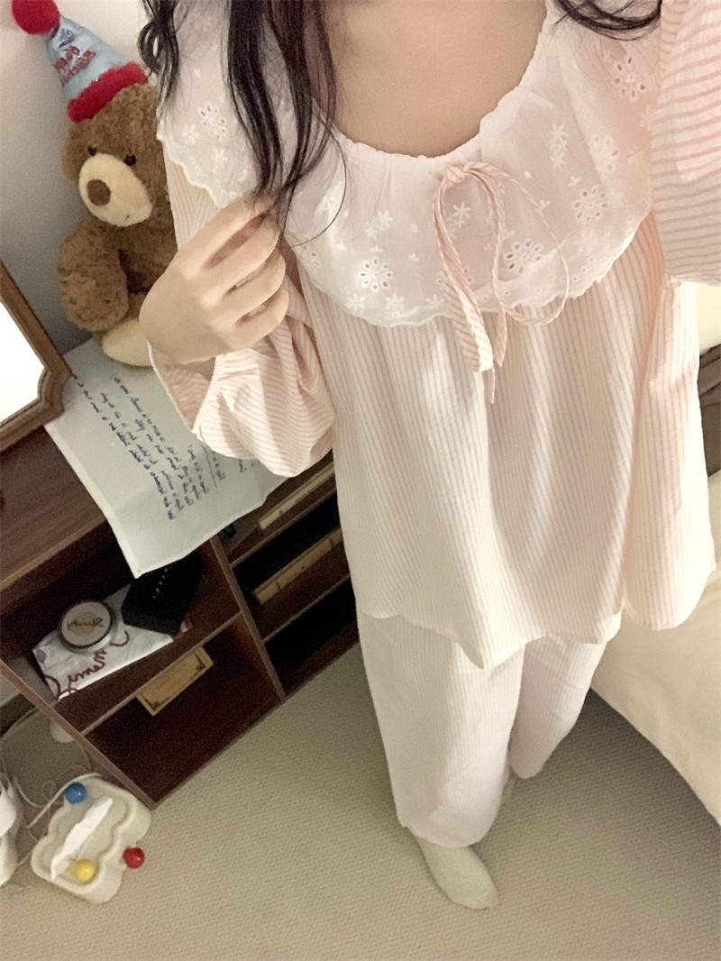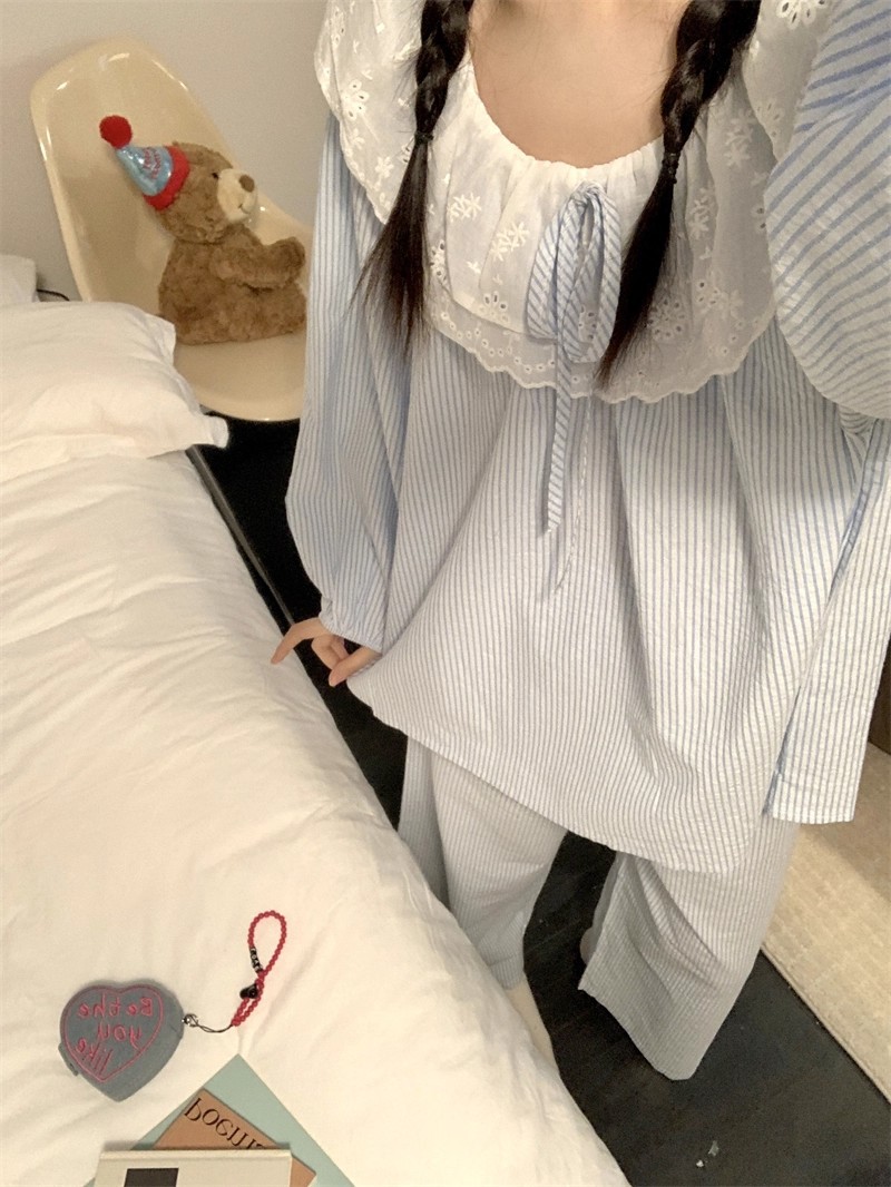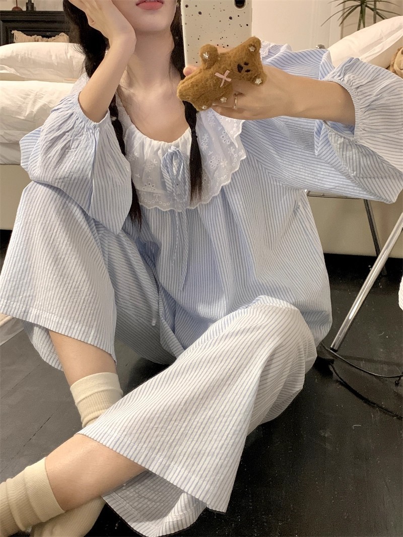 法式花边条纹睡衣女春秋季长袖套装高级感跨境家居服甜美可爱外穿