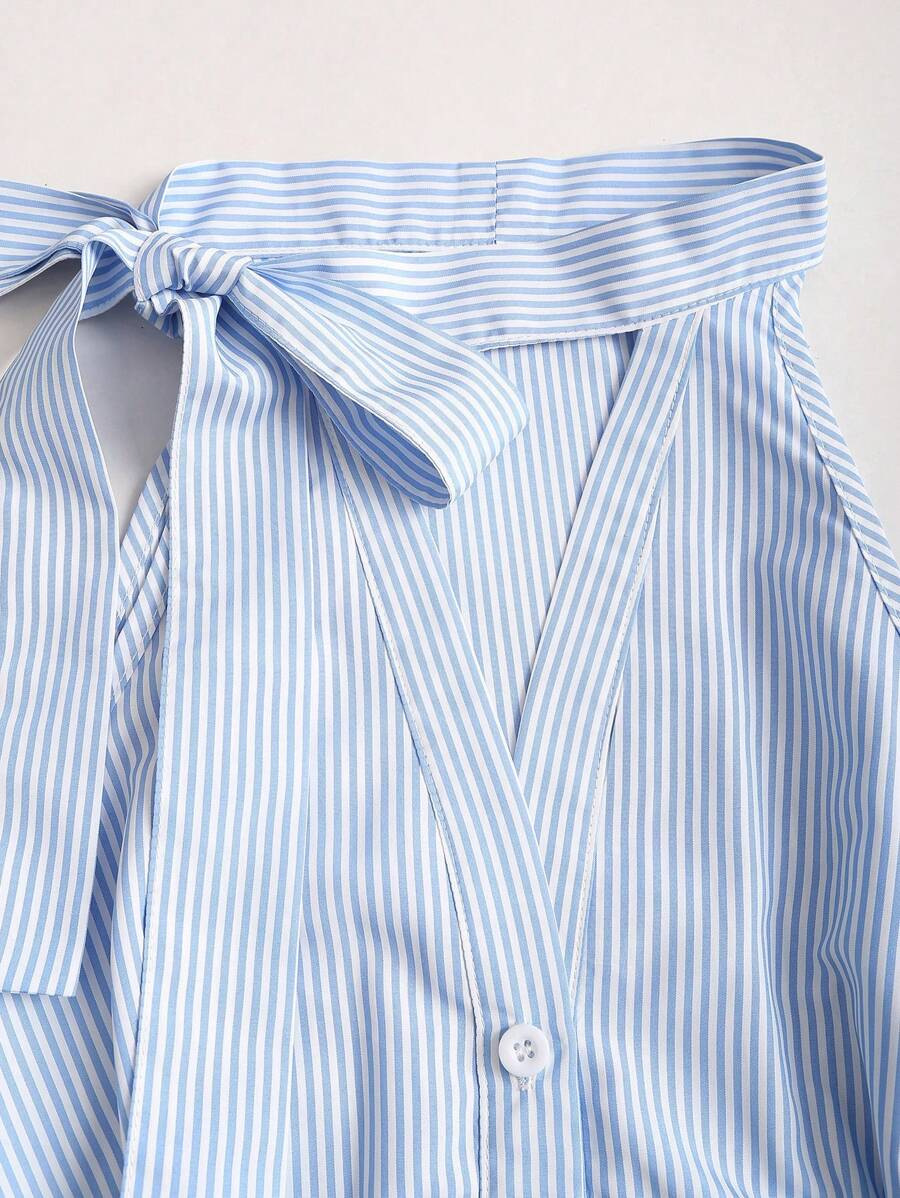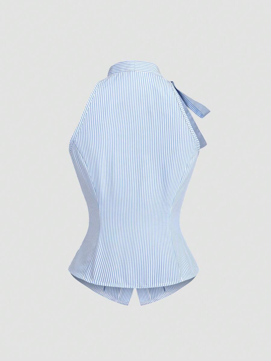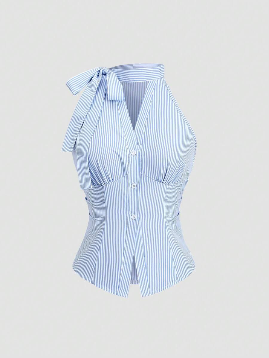 2025夏季新款度假风挂脖大露背简约通勤撞色条纹系带无袖开襟衬衫