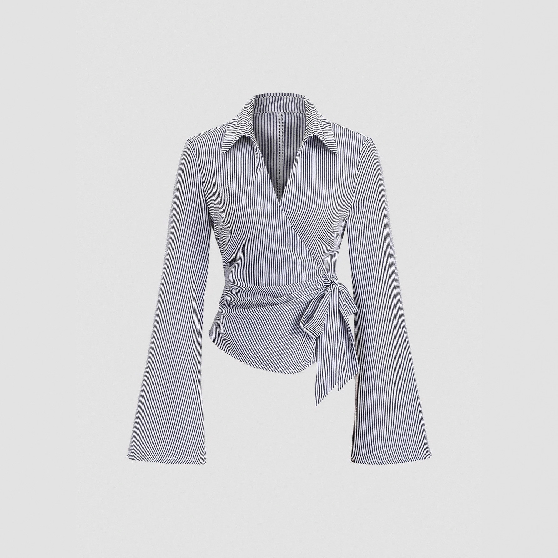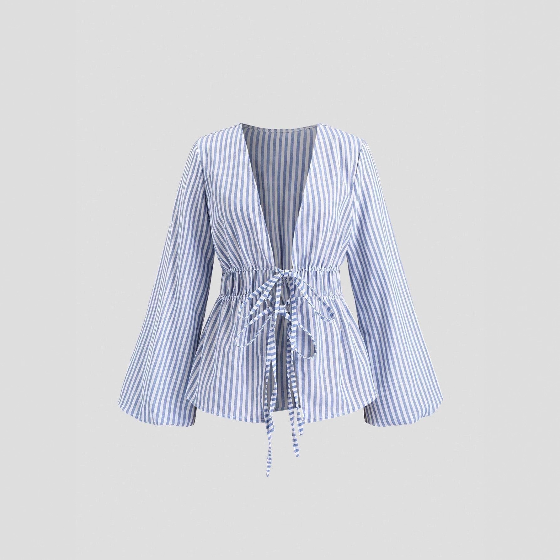 欧美女装蝴蝶结系带条纹上衣休闲 收腰百搭开衫外套