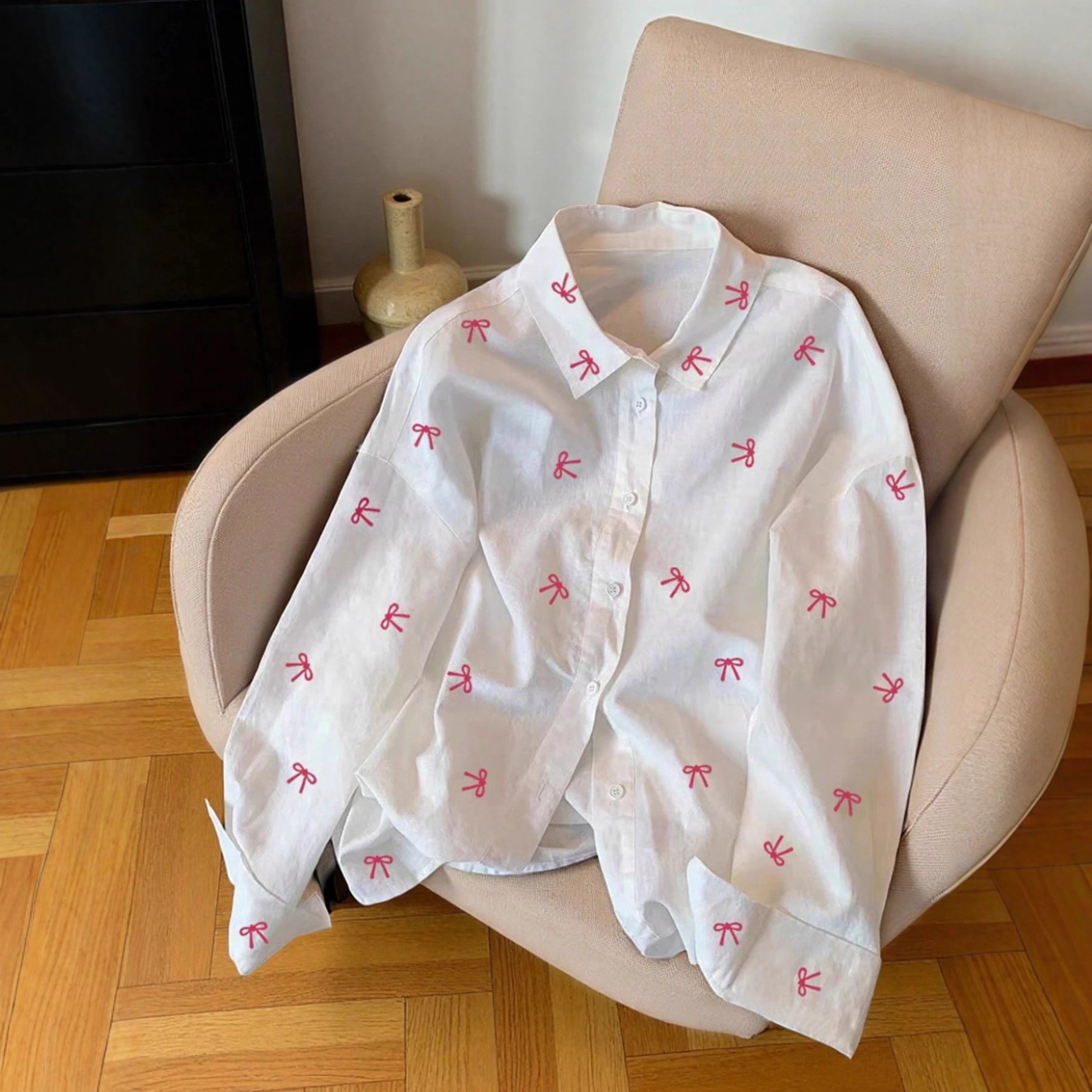 粉色蝴蝶结印花衬衫女2025春夏休闲长袖防晒薄外套上衣潮