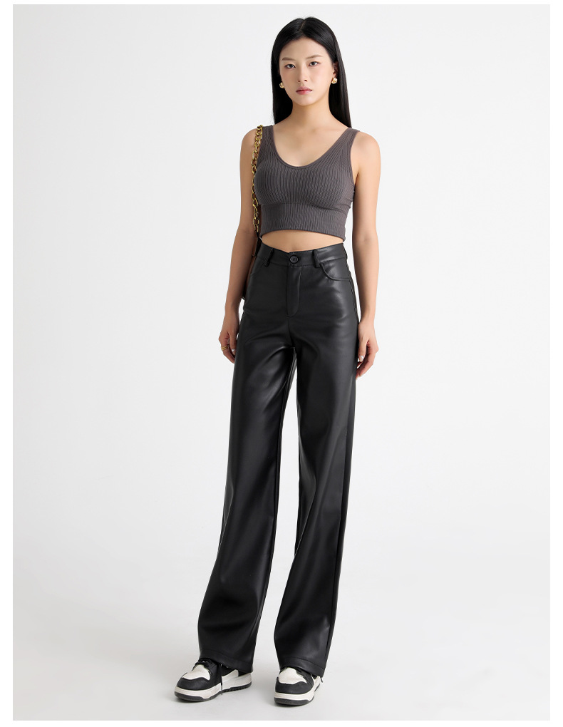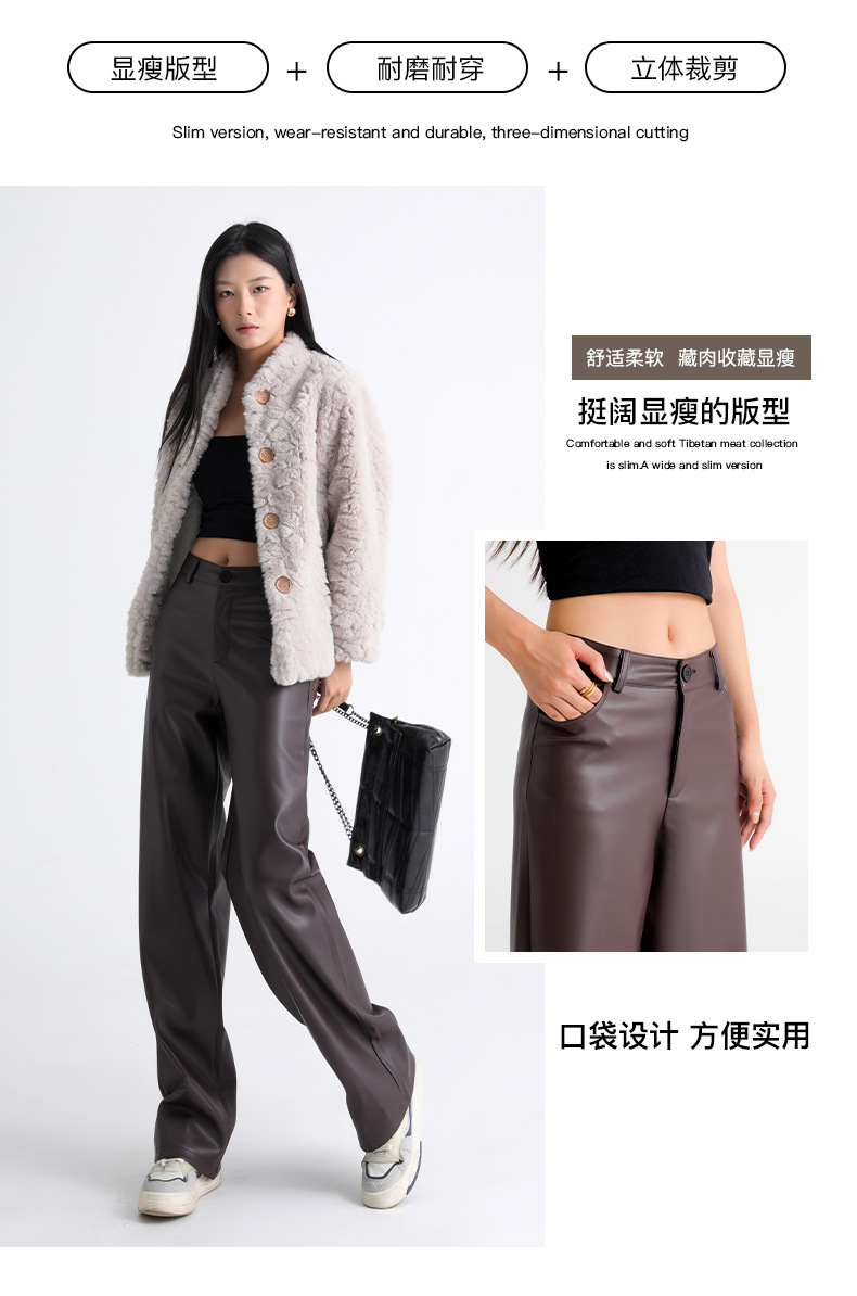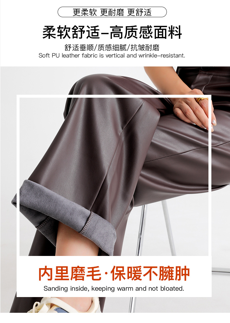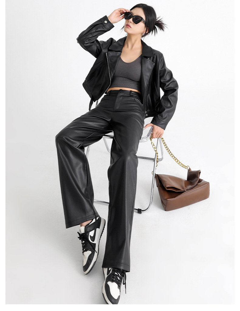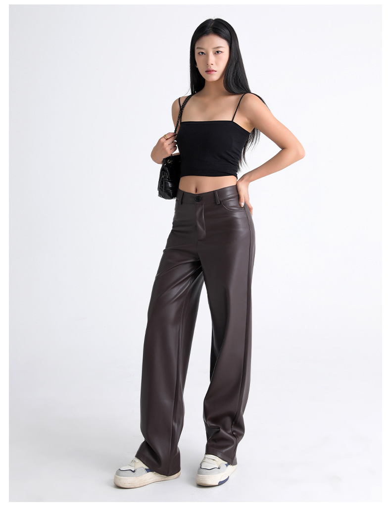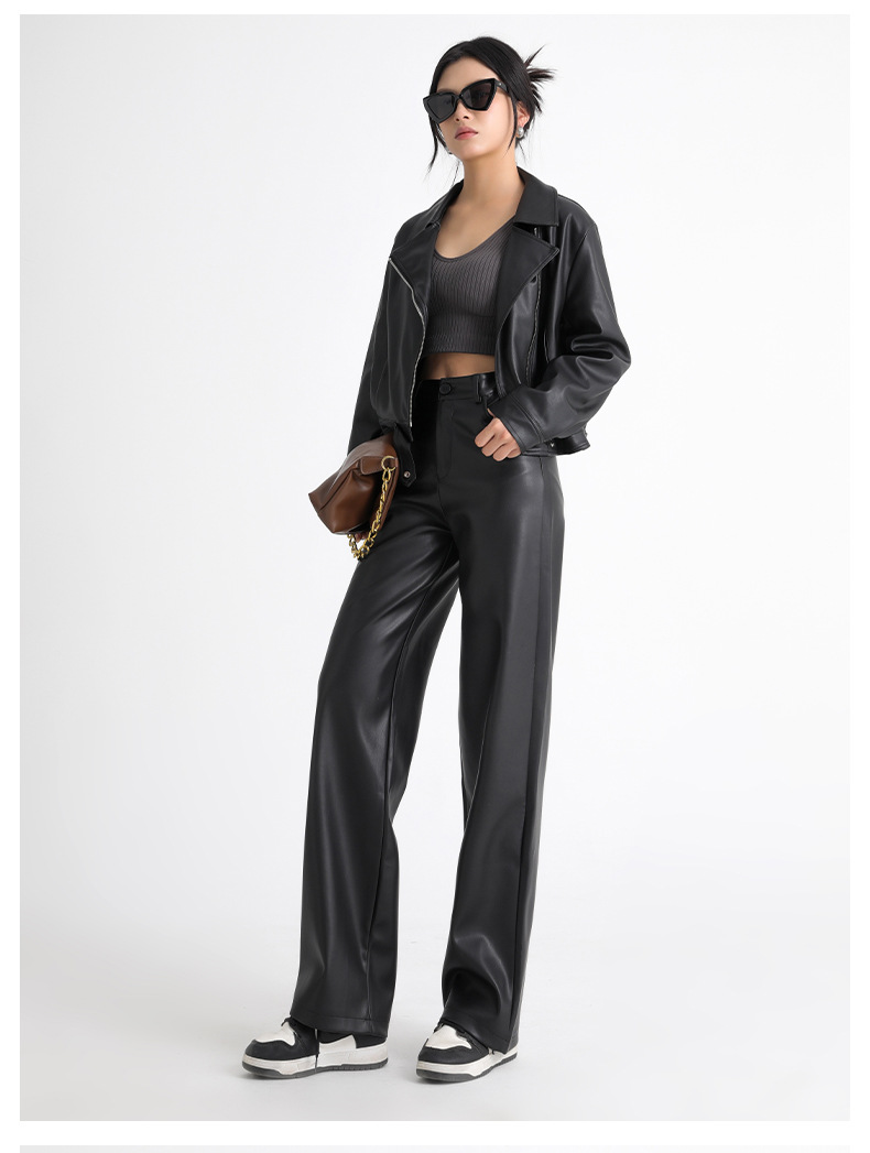 新款美式PU皮裤女春秋冬高腰显瘦垂感休闲直筒裤宽松西装阔腿裤子