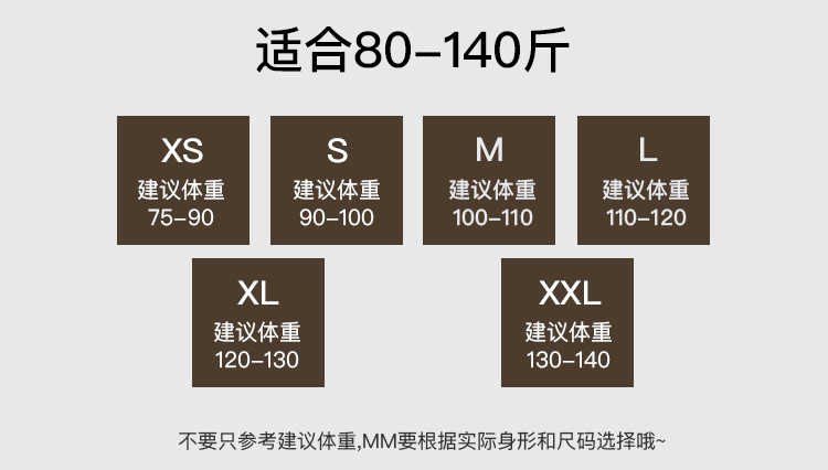 尺码 XS【建议75-90斤】,S【建议90-100斤】,M【建议100-110斤】,L【建议110-120斤】,XL【建议120-130斤】