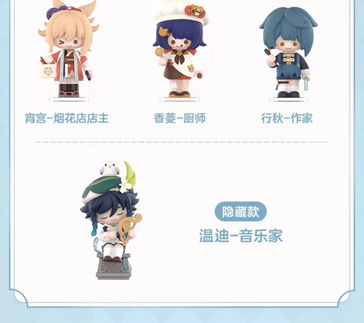 颜色 随机1个(有几率隐藏),12个全新带塑封(有几率隐藏),阿贝多-画家【拆盒确认】,芭芭拉-歌手【拆盒确认】,达达利亚-玩具销售员【拆盒确认】,甘雨-秘书【拆盒确认】,胡桃-气球销售员【拆盒确认】,琴-行政员【拆盒确认】,托马-管家【拆盒确认】,温迪-机长【拆盒确认】,五郎-动物饲养员【拆盒确认】,宵宫-烟花店店主【拆盒确认】,香菱-厨师【拆盒确认】,行秋-作家【拆盒确认】,隐藏-温迪-音乐节【拆盒确认】