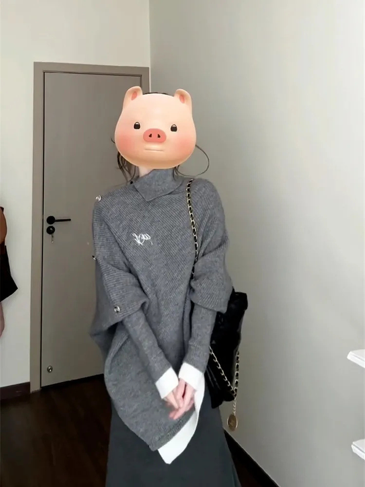 高级设计感高领不规则毛衣女秋冬韩系宽松慵懒风长袖针织斗篷上衣