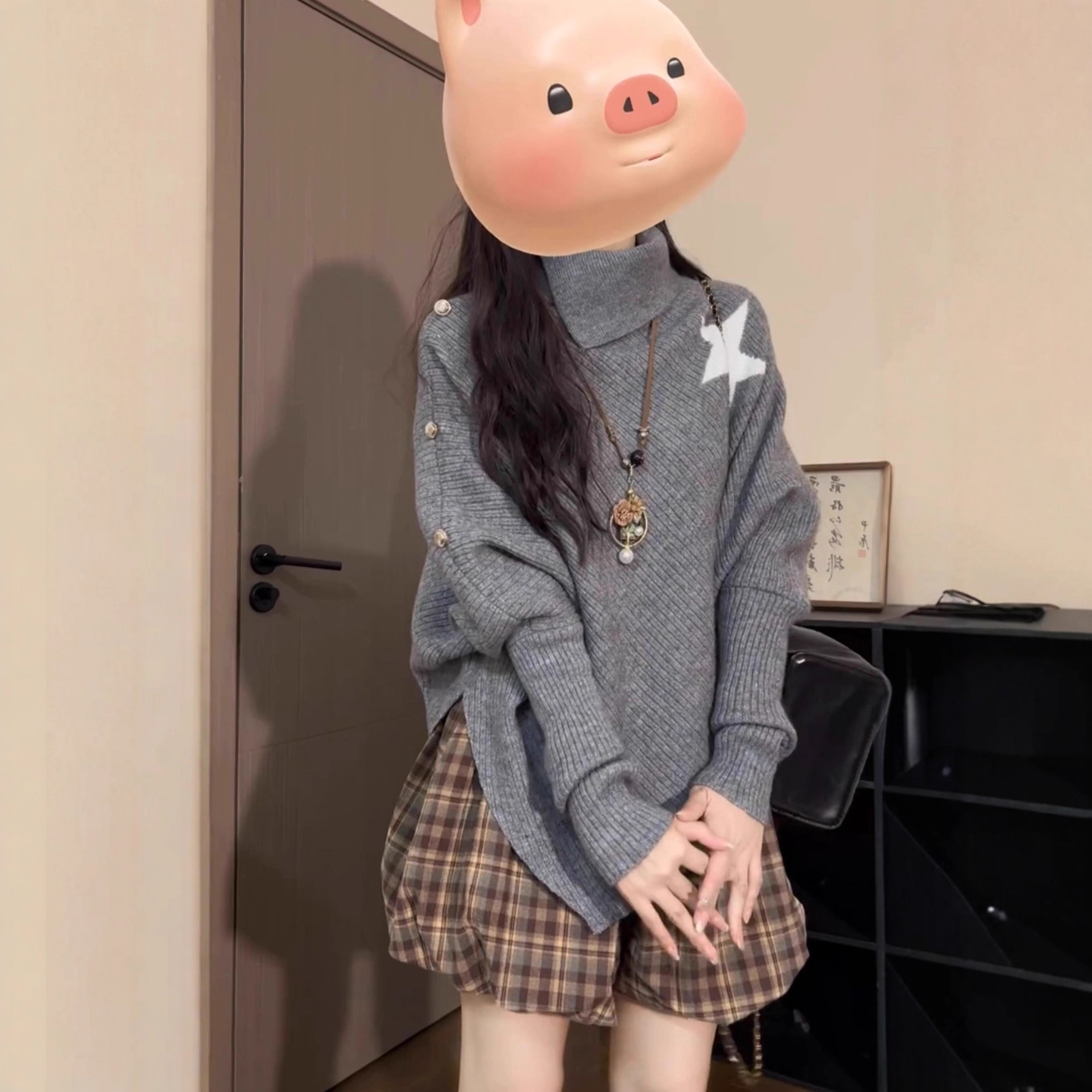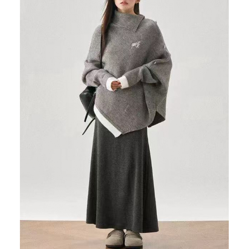 两件/套装韩系复古小个子高领不规则斗篷针织毛衣女+鱼尾半身长裙