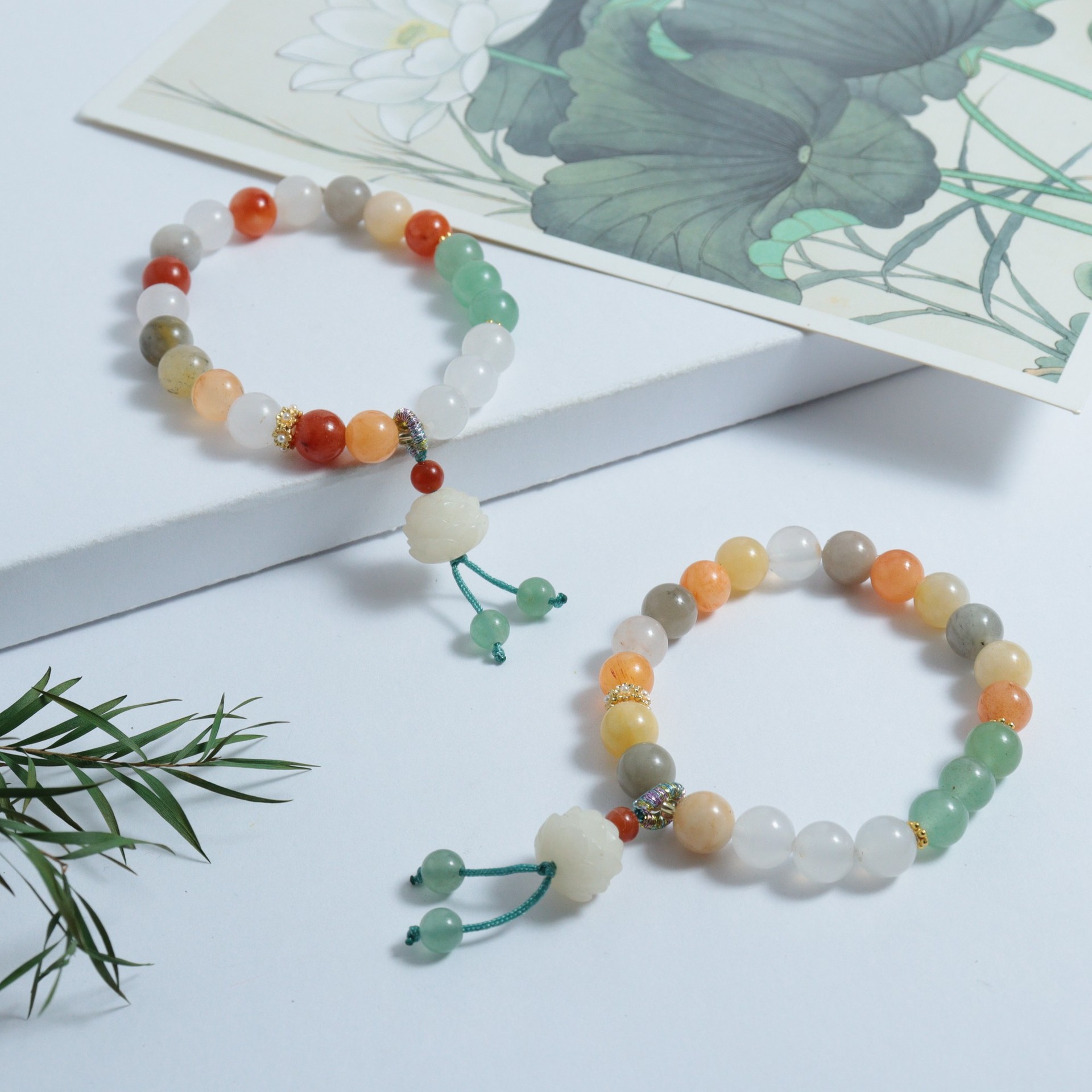 天然新疆ゴールデンシルク翡翠マルチストーン原石翡翠ブレスレットカラフルなブレスレット蓮の花付き男性と女性用